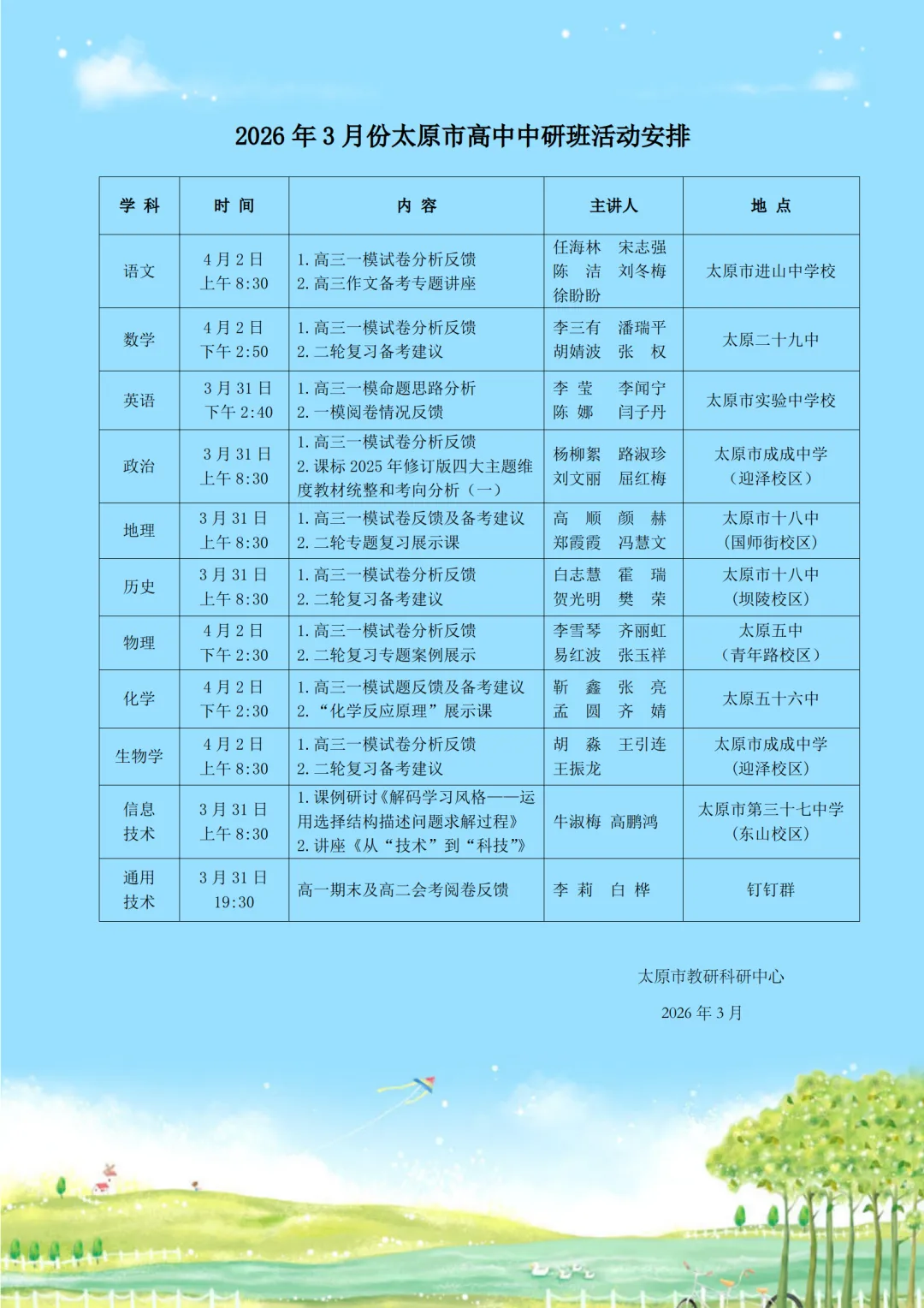 >【中研班】2026年3月份太原市高中中研班活动安排