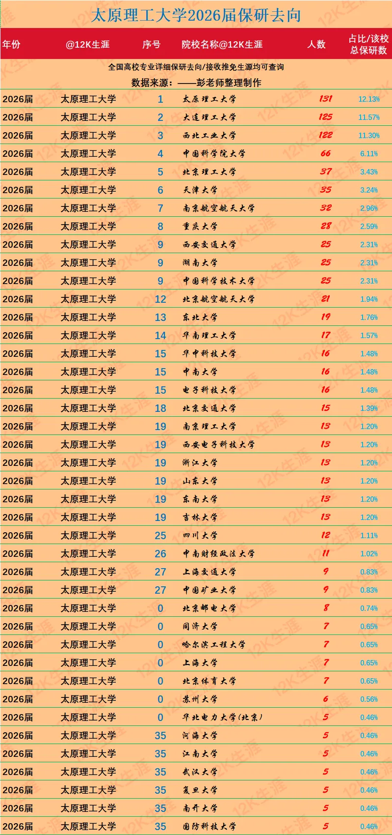 太原理工大学2026届有本科毕业生8117人;共有1080人获得保研资格;全校平均保研率为13.31%。保研去向院校数量:90所