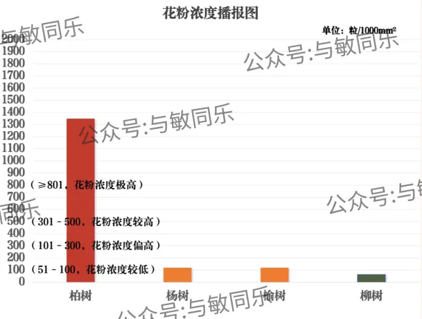 柏树花粉浓度为极高;杨树、榆树花粉浓度为偏高;