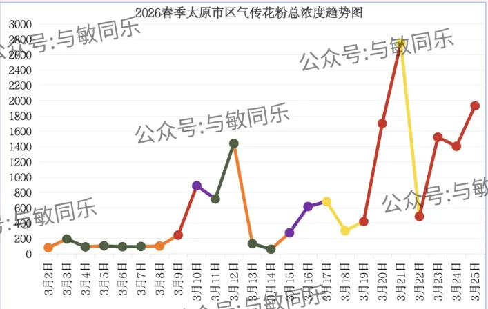 3月26日早8点至3月27日早8点:花粉总数≥801(粒/1000mm²),花粉总浓度为六级(花粉浓度极高)。