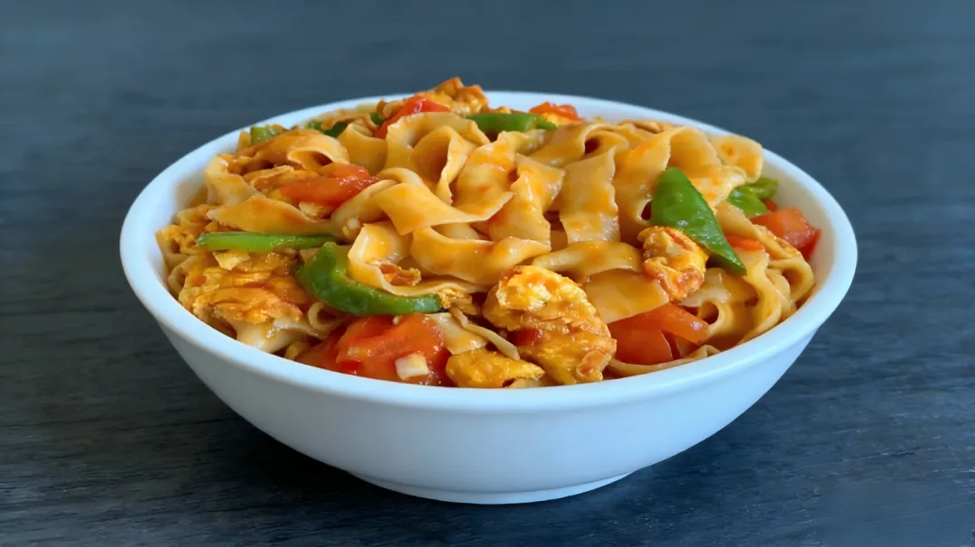 油泼面的精髓在最后那勺热油。辣椒面、蒜末铺在面上,热油“滋啦”一声浇上去,焦香混着蒜香直冲脑门。