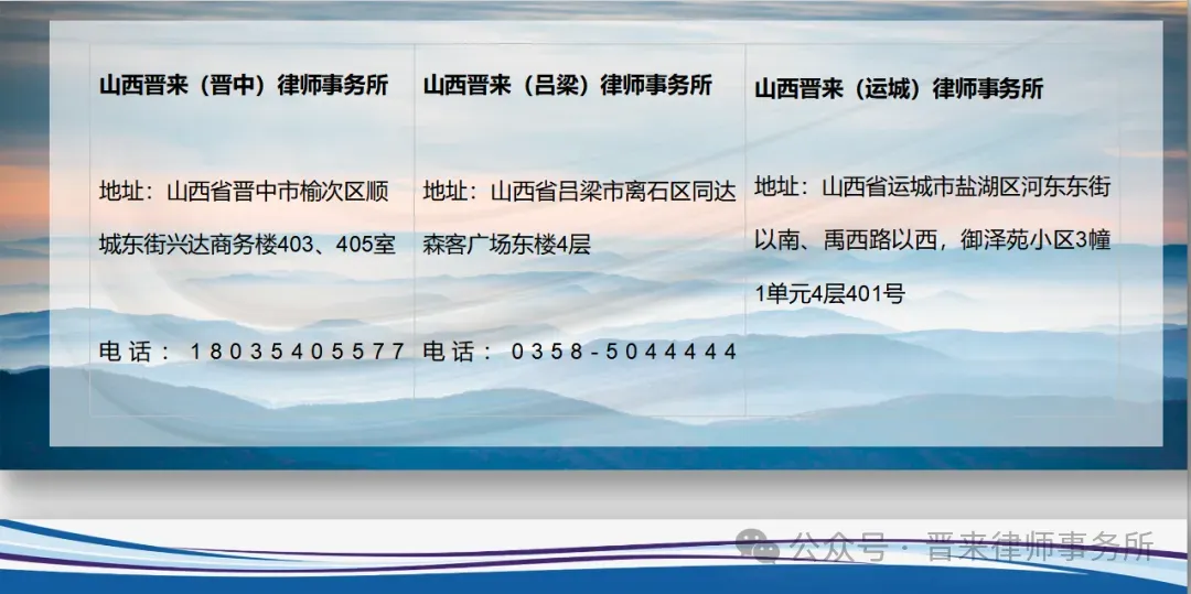 山西晋来律师事务所秉承政治建所、品牌强所、专业立所、责任兴所的发展宗旨,政治上,坚定“两个确立”,坚持党的领导,不断开创党建引领所建发展新局面;文化上,坚持走正道、结善缘、诚待人、实干事,以客户认可和行业口碑为最高荣誉,和合发展;业务上,精益求精,专业高效,合作共赢提供长效法律服务,稳健发展;社会责任上,既尊重事实和法律,为自身和社会创造财富,又不忘初心,积极投身公益服务,为民解难行大义,勇于担当促发展!