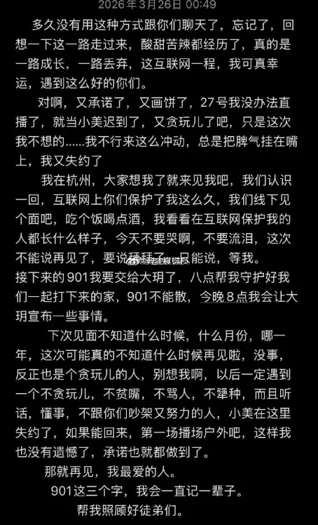 阿宇爆料,娜美和刘二狗家的晓惠均被平台永久封禁。两人因在大型活动现场连麦对骂三分钟,脏话不断,引发平台领导震怒,被当作典型处理。娜美已发长文宣布无限期退网,账号处于禁言状态。娜美徒弟哭诉,师父原本定在 27 号解封回归,却突然改为无限期封禁,自己十分崩溃,表示会和师妹一起守好账号。