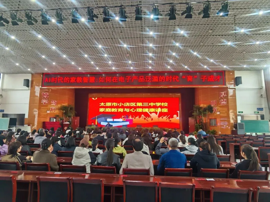 为帮助家长适应人工智能时代的教育新变化,提升科学育儿素养与亲子心理陪伴能力,筑牢和谐共育的家校生态,2026年3月26日,太原市小店区第三中学校政教处在笃行楼五层报告厅,隆重开展主题为“AI时代的家教智慧:如何在电子产品泛滥的时代‘育’子成才”的家庭教育与心理健康专题讲座。全校家长代表齐聚一堂,共学新理念、共探新方法、共护孩子健康成长。