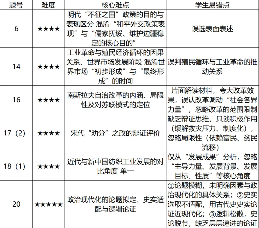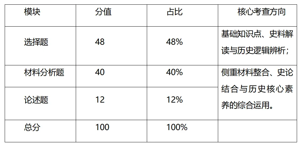 4.考查导向:以立德树人为核心,围绕国家治理、文明交流、民族复兴、国际秩序、现代化探索等核心主题,凸显历史学科的社会价值,强化家国情怀与历史思辨能力的培养。