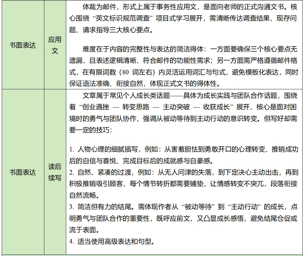 应用文写作:规范邮件格式、要点全覆盖,确保“调查结果+问题+请求指导”无遗漏;优化句式搭配,避免单一简单句,提升表达流畅度。