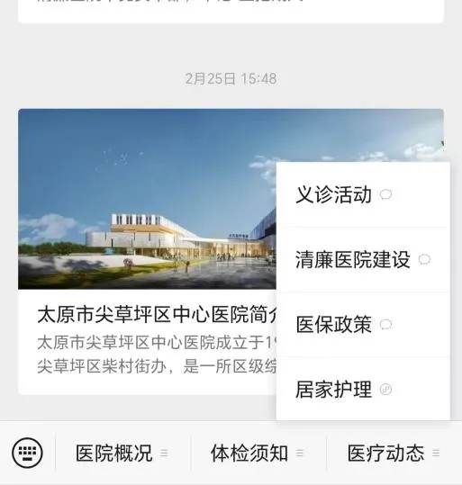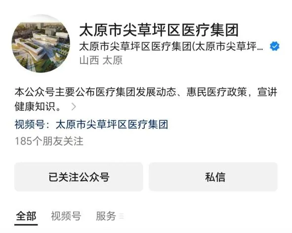 1. 打开微信,搜索并关注官方微信公众号“太原市尖草坪区医疗集团”;