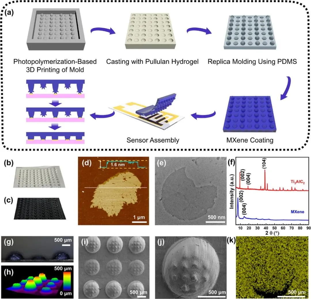 图1. MSM结构压力传感器的制备工艺及结构表征。(a) MSM结构柔性压力传感器的制备工艺示意图。(b) 未涂覆MXene的MSM结构PDMS薄膜照片。(c) 涂覆MXene后的MSM结构PDMS薄膜照片。(d) MXene薄片的原子力显微镜(AFM)图像。(e) MXene纳米片的透射电镜(TEM)图像。(f) Ti3AlC2和MXene的X射线衍射(XRD)图谱。(g) 主/次微穹顶高度比为1:0.5的MSM结构的侧视显微照片。(h) 主/次微穹顶高度比为1:0.5的MSM结构的三维光学显微镜扫描图像。(i) 传感器整体的扫描电镜(SEM)图像。(j) 单个微穹顶的放大SEM图像。 (k) 单个微穹顶的EDS映射中Ti元素的分布图。