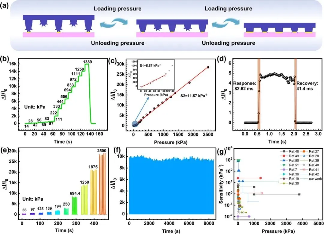 图2. MSM结构压力传感器的传感机制和性能表征。(a) MSM结构压力传感器的工作原理示意图。(b) 传感器在14至1389 kPa压力范围内的ΔI/I0-压力曲线。(c) 传感器在不同外部压力下的灵敏度。(d) 传感器在1.4 kPa压力下的响应和恢复时间曲线。(e) 传感器在不同压力下的重复性输出波形。(f) 传感器在833 kPa压力下(约2900次压力循环)的耐久性测试结果。(g) 基于MSM的传感器与先前报道的传感器的灵敏度和量程比较。