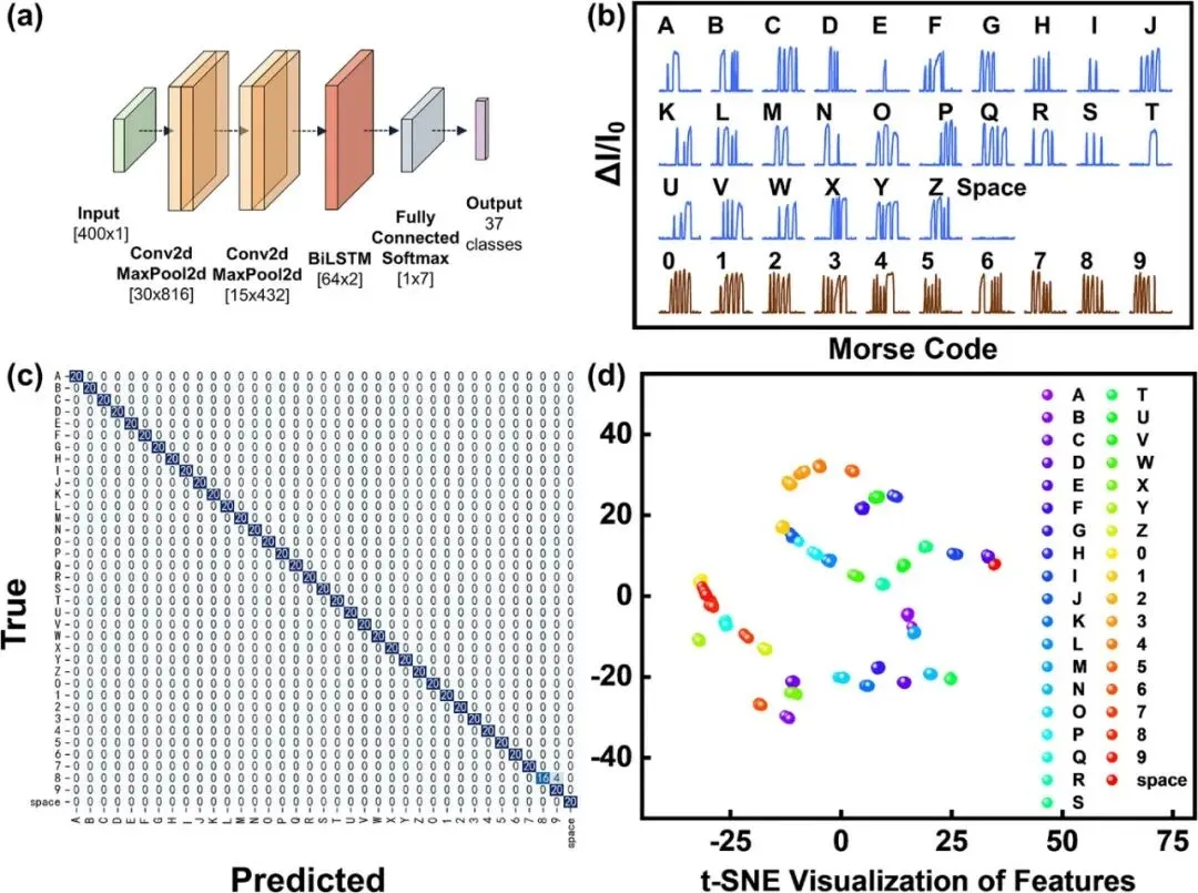 图3. 基于MSM结构传感器的莫尔斯电码识别。(a) CNN-BiLSTM模型架构示意图。 (b) 单个传感器采集的摩尔斯电码按键信号示意图(“-”和“.”通过按键持续时间区分)。(c) 经过50个训练周期后的混淆矩阵(测试准确率:99.5%)。(d) t-SNE降维可视化图,展示了不同类别的特征分布。