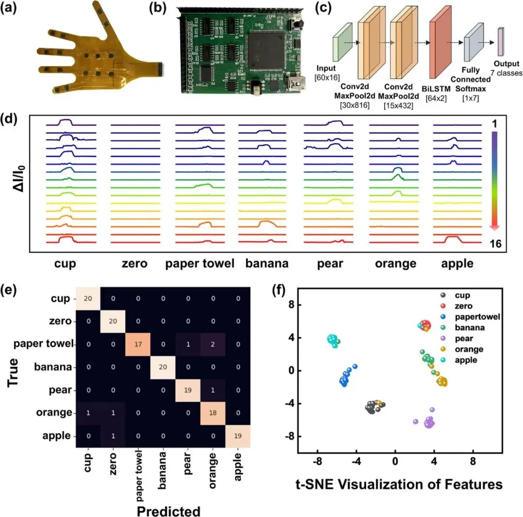 图4. 基于MSM结构的掌形传感器阵列的物体抓取识别。(a) 16通道掌形传感器阵列照片。(b) 基于STM32F407的16通道信号采集电路板照片。(c) CNN-BiLSTM模型架构示意图。(d) 掌形传感器阵列抓取不同物体时的输出信号示例。(e) 经过50个训练周期后的混淆矩阵(测试准确率:95%)。(f) t-SNE降维可视化图,展示了不同物体类别的特征分布。