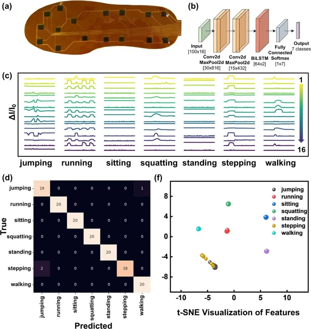 图5. 基于MSM结构的鞋底形传感器阵列的运动模式识别。(a) 16通道鞋底形传感器阵列照片。(b) CNN-BiLSTM模型架构示意图。(c) 不同运动模式下鞋底形传感器的输出信号。(d) 50个训练周期后的混淆矩阵(测试准确率:97.9%)。(e) t-SNE降维可视化图,展示了不同运动模式下的特征分布。