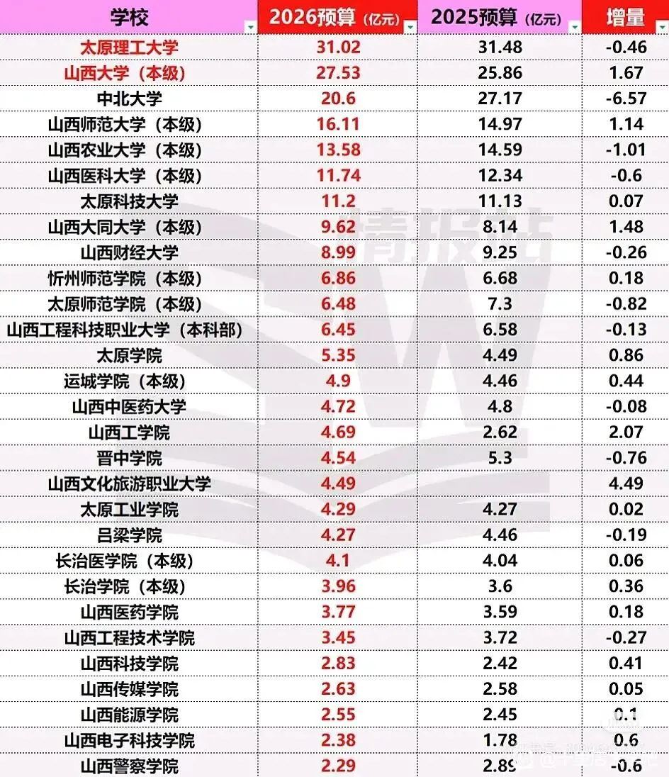 据@SW西南高校情报站 统计,山西省属高校预算中太原理工大学以31.02亿元排名第一,其次是山西大学27.53亿元排名第二,中北大学20.6亿元排名第三。这三所大学也是山西高校的老牌三强,也是山西省双一流大学高校(太原理工大学、山西大学)和最有希望冲击双一流高校(中北大学)。增长情况,山西大学增长了1.67亿元、山西师范大学增长了1.14亿元、山西大同大学增长了1.48亿元,都是比2025年增长比较多的高校。减少情况,太原理工大学减少了0.46亿元,中北大学减少了6.57亿元,山西农业大学减少了1.01亿元,相对而言是减少较多的高校。山西中医药大学是“大学”中预算中最低的,为4.72亿元,比2025年减少0.08亿元。忻州师范学院是“学院”中预算最高的,有6.86亿元,比2025年增加0.18亿元。