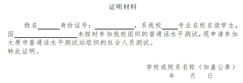 自愿报名的社会人员(不含在读高校学生)可就近在太原市普通话水平测试站报名;在读高校学生确需报名的,须提供学校出具的相关证明材料(见第七部分测试须知(一)),若无法提供相关学生身份证明材料,一律按社会人员对待。
