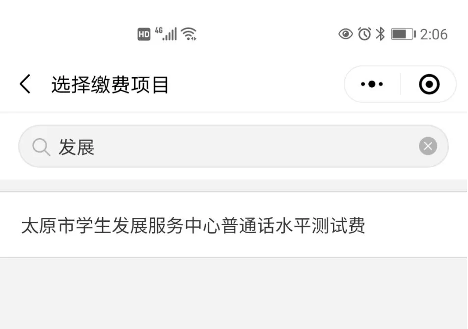第四步:输入关键字“发展”,显示“太原市学生发展服务中心”普通话水平测试,点击进入