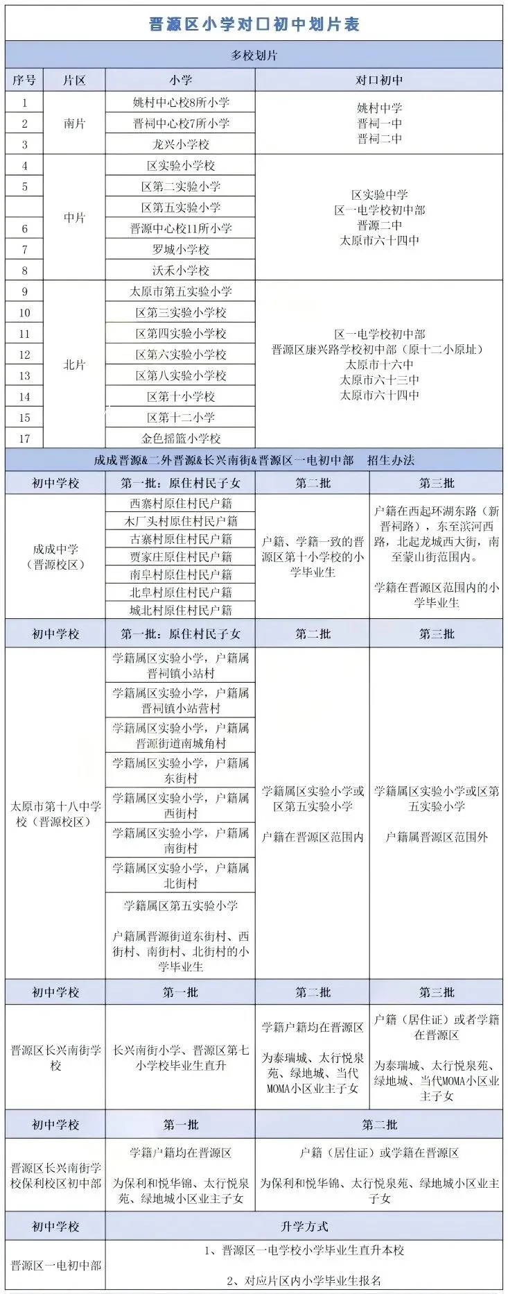 晋源区小学对口初中划片表