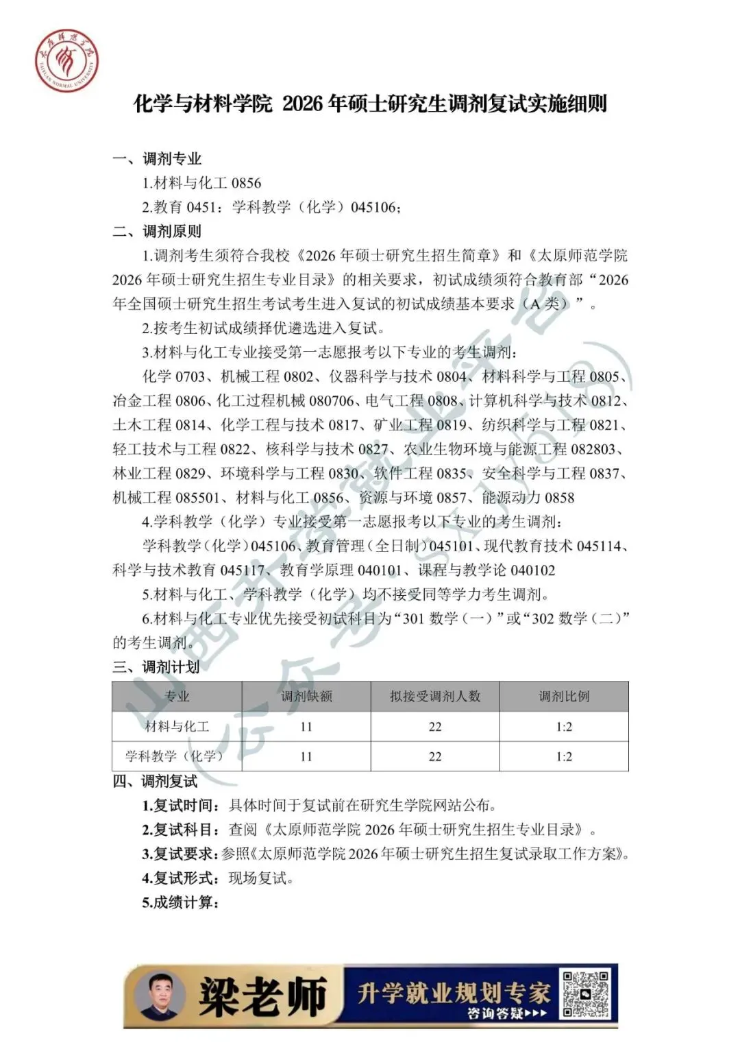 为做好太原师范学院2026年硕士研究生招生调剂工作,根据《2026年全国硕士研究生招生工作管理规定》(教学〔2025〕2号)、《关于进一步规范全国硕士研究生招生调剂工作的通知》(教学司〔2025〕5号)、《关于做好2026年全国硕士研究生招生复试录取工作的通知》(教学司〔2026〕3号)和山西省招生考试管理中心《关于做好我省2026年硕士研究生复试录取工作的通知》(晋招考研〔2026〕5号)等文件精神,结合学校实际,特制定本办法。科学制定调剂工作办法,规范流程标准,严明工作纪律,严格政策执行,推进分类选拔,切实提升招生质量。从严规范调剂管理,以学业水平为核心依据,严禁设置歧视性条件。涉及第一志愿专业等学术要求,须经本单位学位评定委员会审核。深化招生录取“阳光工程”,全面公开招生信息,强化服务意识,注重人文关怀,专人负责咨询接听与诉求答复。强化组织领导与协同联动,压实主体责任,严格执行“集体议事、集体决策、会议决定”规程,保障调剂工作安全平稳有序。1. 调剂考生须符合我校2026年硕士研究生招生简章和招生专业目录的相关要求,且初试成绩须符合教育部“2026年全国硕士研究生招生考试考生进入复试的初试成绩基本要求”(A类)。2. 调剂考生第一志愿专业与调入专业相同相近,或初试科目与调入专业初试科目相同相近。3. 初试科目为全国统一命题科目的学科,应优先接受初试参加相同全国统一命题科目的考生调剂。4. 对申请同一专业、初试科目完全相同的调剂考生,应当按考生初试成绩择优遴选进入复试。5. 旅游管理专硕可接收第一志愿报考旅游管理、工商管理、公共管理、工程管理、会计、图书情报、审计专硕的考生。6. 报考旅游管理和教育硕士中教育管理的考生,须满足大学本科毕业且有3年以上工作经验;或获得国家承认的高职高专毕业学历或大学本科结业后,符合专业相关学业要求,达到大学本科毕业同等学力并有5年以上工作经验的人员。7. 每轮次调剂均按招生计划采取差额复试形式,生源充足学科接受调剂的考生比例原则上不低于120%;不足1名的按1名计算。各院系可根据本学科专业生源及缺额情况合理设置比例。8. 须符合《太原师范学院2026年硕士研究生招生专业目录》中的报考条件,以及各院系拟定的招生复试调剂工作实施细则的相关要求。1. 我校接收的所有调剂考生均须通过教育部“全国硕士研究生招生调剂服务系统”进行。2. 太原师范学院硕士研究生招生委员会(以下简称招委会)统一管理本单位调剂工作,统一审核院系调剂细则、发布调剂信息、监督巡查、审核调剂复试及录取名单、办理相关手续。3. 各招生院系在学校招生调剂工作实施办法基础上,根据学科(专业)特点,确定调剂缺额计划、差额比例,制定本单位调剂录取工作实施细则。调剂细则须经院系学位评定分委员会讨论通过后,报招委会办公室,提交校学位评定委员会审议。4. 严禁将考生第一志愿报考单位、毕业院校、提交调剂志愿的时间先后顺序等非学业水平标准作为依据。严禁以考生所在单位、行业、地域、学校层次类别等非学业水平标准限定调剂生源范围,严禁设置歧视性调剂条件。5. 招生院系要严格按照招委会统一部署,在规定时间内开展调剂工作,严禁任何个人未经授权擅自发布调剂信息。6. 进入调剂复试考生名单,由招生院系负责人签字确认后,报送招委会办公室,经分管校领导审定后予以发布。对所有申请调剂但未进入调剂复试的考生,须逐一进行原因备注及记录,确保择优遴选、公平公正。如在本批次调剂复试录取结束后仍有缺额,须适时重新开放调剂系统。1. 研招网调剂系统将于4月8日起启用。考生要提前查看我校公告,了解拟调剂专业(领域)、名额、调剂系统开始及结束时间,登录“全国硕士研究生招生调剂服务系统”,查看调剂缺额信息并填报调剂志愿。2. 我校将在规定时间内确定是否接收考生调剂志愿并发送复试通知。若考生在我校发送复试通知前修改了调剂志愿,学校将无法发送复试通知。3. 我校通知考生参加复试后,考生应在规定时间内,登录“全国硕士研究生招生调剂服务系统”,确认参加我校复试,逾期视为自动放弃复试资格,撤销复试通知,依次递补其他考生。4. 考生要及时登录我校研究生学院网站查看复试安排和复试要求,按时参加复试。具体参照《太原师范学院2026年硕士研究生复试录取工作实施方案》及相关院系2026年调剂工作实施细则执行。复试成绩计算办法和总成绩计算办法依照《太原师范学院2026年硕士研究生复试录取工作实施方案》执行。1. 依据招生计划和调剂名额,各院系提出拟录取名单,拟录取名单经招委会审核后,及时通过调剂系统管理平台对拟录取的调剂考生发送待录取通知。如考生已接受了其他单位的待录取通知,视为主动放弃待录取资格。考生应密切关注调剂系统内的通知,须在通知规定的时间内通过调剂系统接受或拒绝接受待录取通知,逾期不接受者视为自动放弃待录取资格,学校将取消其待录取通知,递补其他考生。如因个人原因未及时确认导致待录取通知逾期被撤销的,责任由考生本人负责。2. 拟录取名单根据考生参加复试学科(专业、方向、学习形式),按考试总成绩从高分到低分依次确定。3. 复试成绩不合格(低于60分)者不予录取;同等学力者加试科目成绩不计入总分