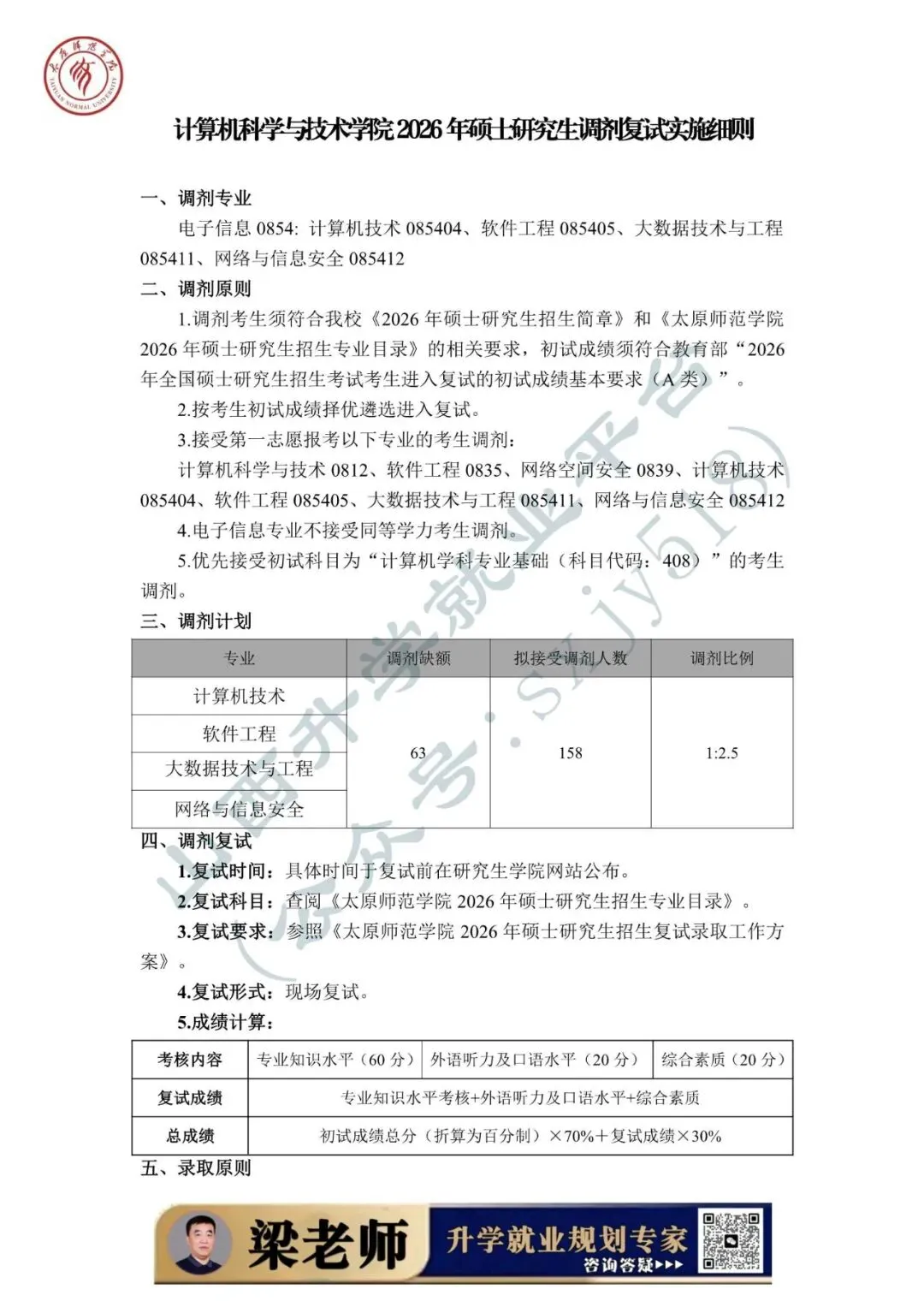 全国各高校复试分数线、复试名单近期集中公布,本周末首批复试将全面启动,下周起各院校复试将陆续展开;预调剂系统也将于3月28日开放报名。今年过国家线考生约150万,全国研究生总录取计划110万;推免(保研)约30万,统考实际剩余名额仅约80万。这意味着即便过线,仍有约70万考生最终无法录取竞争极为激烈。26年太原理工复试线整体比25年明显上涨,热门专硕涨得最多,学硕普遍小幅上涨。山西大学26年复试线整体大幅上涨,热门专硕/文科自划线专业涨得最猛,多数专业比25年高10–30分。中北大学复试分数线几乎所有专业都高于25年,工学热门专硕涨幅普遍在20–50分。专硕竞争更激烈,涨幅普遍大于同专业学硕。复试工作即将开始,请考生密切关注高校研究生院网站和各学院网站相关通知,并按要求提前做好复试准备工作。如需专业老师指导复试或调剂上岸,请微信联系。