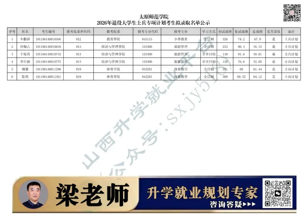 根据《2026年全国硕士研究生招生工作管理规定》(教学〔2025〕2号)《关于做好2026年全国硕士研究生招生复试录取工作的通知》(教学司〔2026〕3号)和《关于做好我省2026年硕士研究生复试录取工作的通知》(晋招考研〔2026〕5号)等相关文件精神,结合学校实际情况,现将我校“退役大学生士兵计划”考生复试资格审核相关事项安排如下:一、依据教育部有关政策,我校自主确定“退役大学生士兵”专项计划的复试分数线。纳入“退役大学生士兵”专项计划招录的考生,不再享受退役大学生士兵初试加分政策。二、我校“退役大学生士兵”专项计划复试分数线:以A类考生进入复试的初试成绩基本要求为基准,各科降分8%进入复试。三、我校“退役大学生士兵”专项计划考生复试时间及考场安排与一志愿考生复试时间相同,请关注我校研究生学院主页发布的相关通知。四、请符合以上条件并收到复试通知的考生务必于复试前将相关证明材料扫描合成一个PDF格式电子版文件(命名格式:士兵计划材料+考生编号+姓名.pdf),并通过“太原师范学院研究生招生管理系统”(https://yjs.chaoxing.com/ppem/tynu/login)提交,审核无误后将相应证件复印件邮寄至我校研究生招生办公室,逾期不提供相关证明材料的考生视为放弃复试资格。五、证明材料清单:本人居民身份证(正、反)、准考证、学历学位证书(应届本科毕业生提供学生证)、《应征公民入伍批准书》和《退出现役证》、考生个人档案中的《义务兵退出现役登记表》或《士官退出现役登记表》复印件。太原师范学院研招办