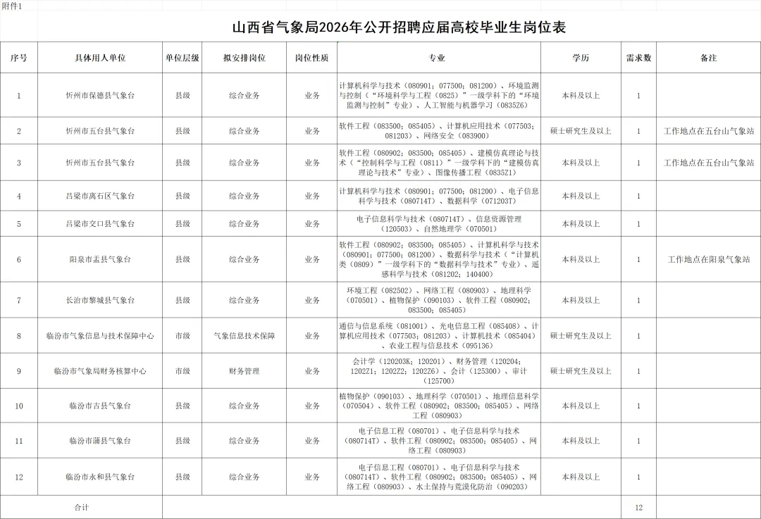 ❗注意:只是招聘计划,是否举办请提前咨询清楚再前往,避免白跑一趟哟!山西省气象局2026年公开招聘应届高校毕业生12名
