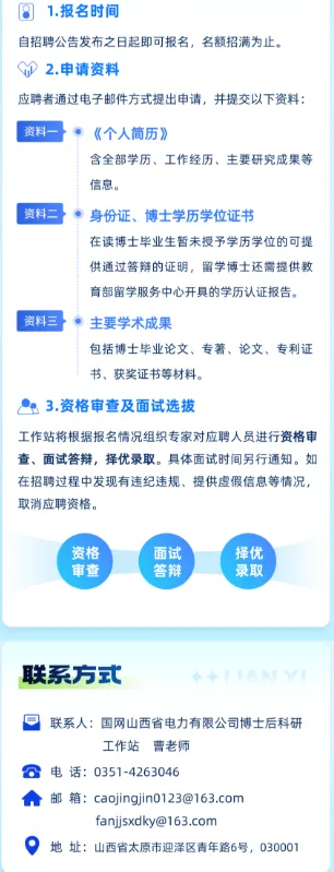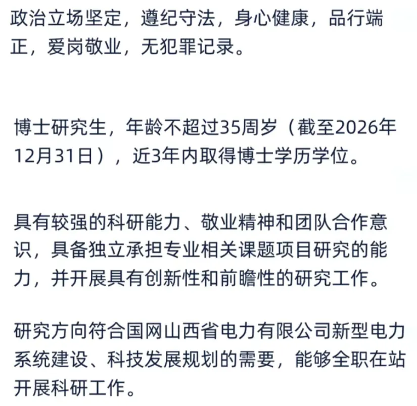 小编提醒:微信搜索并关注【太原本地宝】,在聊天框发私信【招聘】获取以上单位招聘公告详情,了解报名时间及附件材料下载入口。国网山西省电力有限公司2026年博士后科研工作站招聘