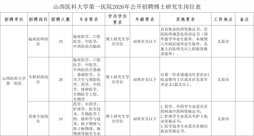 ✅山西医科大学第一医院2026年公开招聘博士研究生100名,均为专业技术岗位