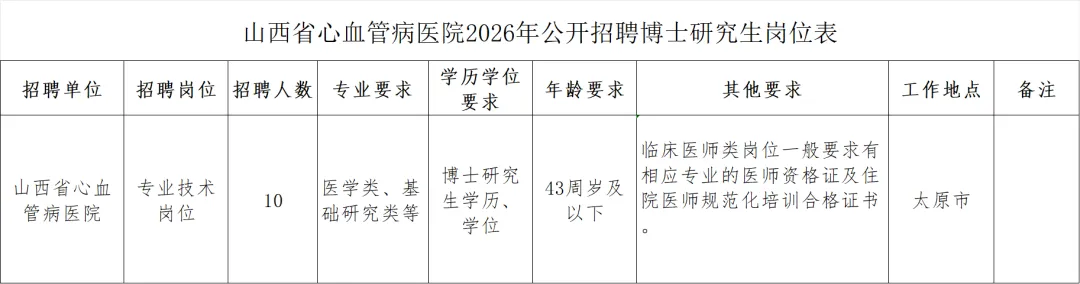 ✅山西省心血管病医院(山西省心血管病研究所)2026年公开招聘博士研究生10名