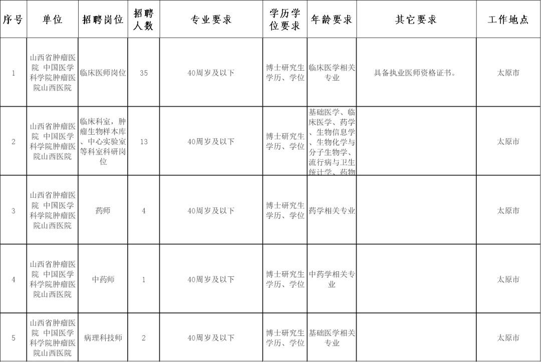 ✅山西省肿瘤医院中国医学科学院肿瘤医院山西医院2026年公开招聘博士研究生55名