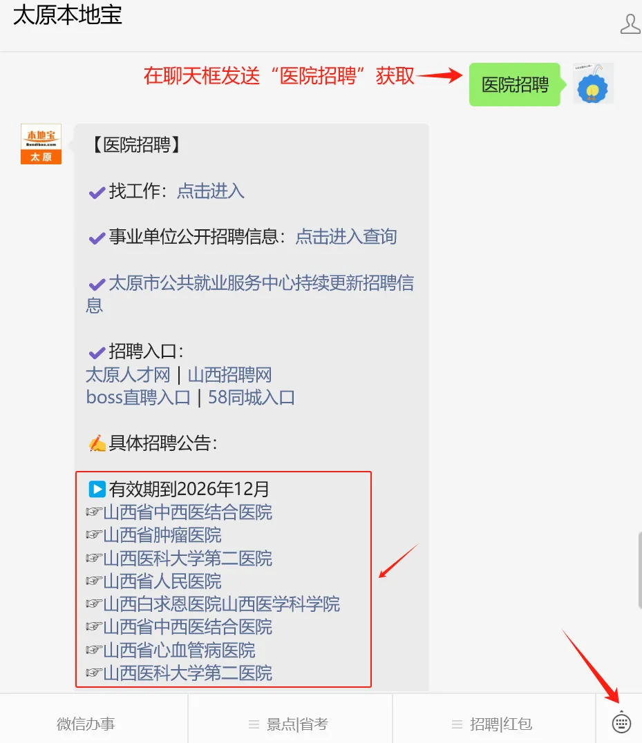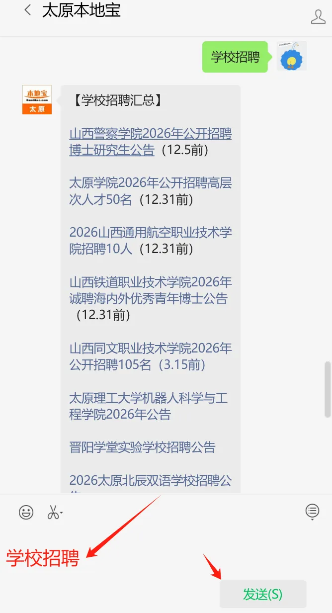 📢小编提醒:在【太原本地宝】微信公众号聊天框发送【学校招聘】即可获取以上信息招聘详情、报名入口、附件下载入口。另外私信发送【招聘】还能获取更多太原招聘入口及详情哟!