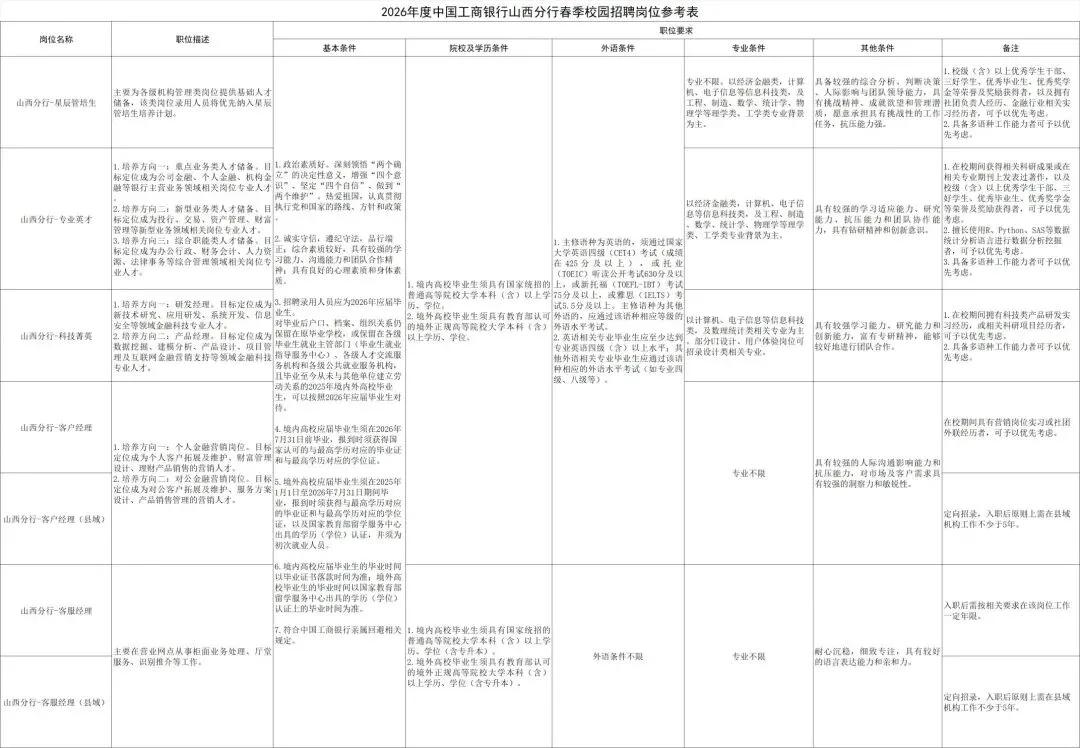 各岗位的工作职责、应聘条件和具体要求见中国农业银行招聘网站(https://career.abchina.com.cn)岗位详情。