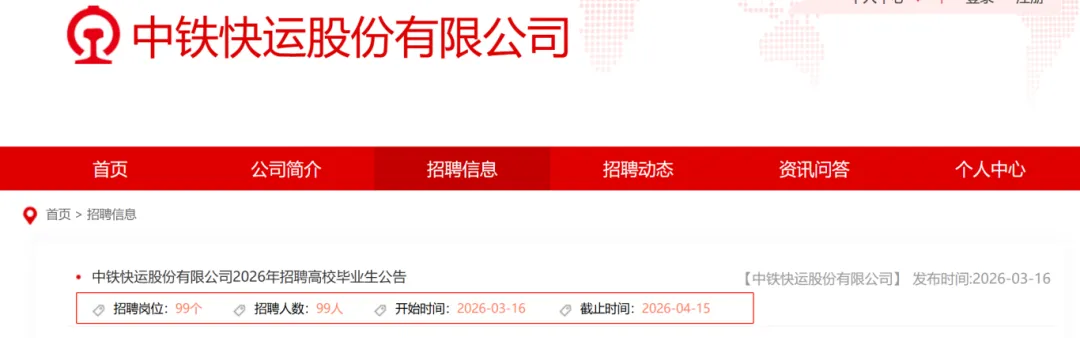 中铁快运股份有限公司2026年招聘公告(99人,含太原分公司2人)
