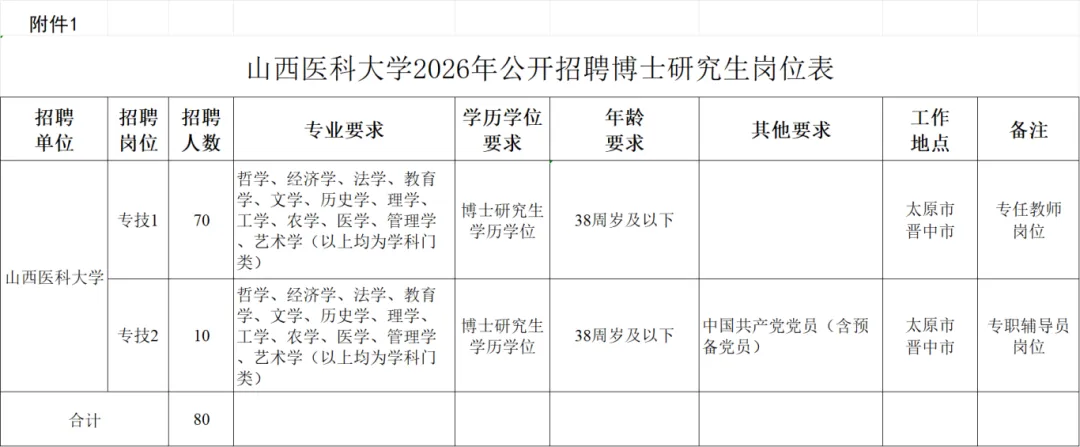 山西医科大学2026年公开招聘博士研究生80名,均为专业技术岗位。招聘岗位所需的具体条件以《山西医科大学2026年公开招聘博士研究生岗位表》(附件1)的要求为准。