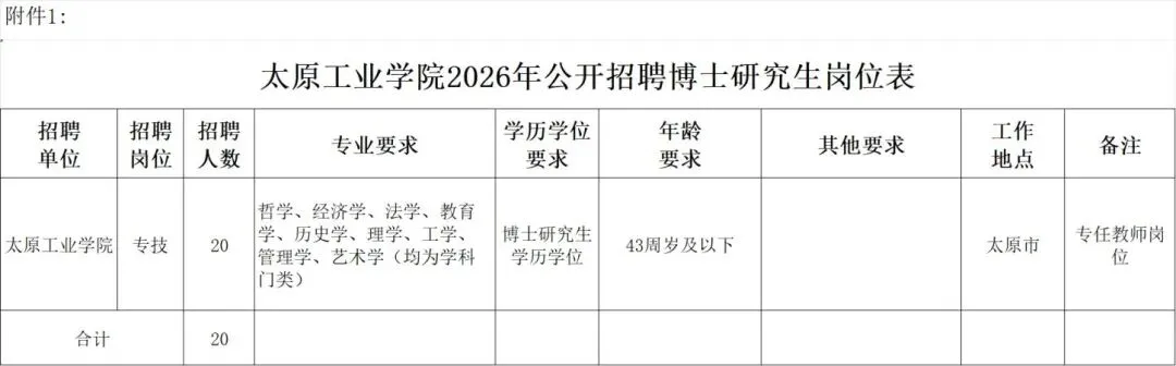 太原工业学院2026年公开招聘博士研究生20名,均为专业技术岗位。招聘岗位所需的具体条件以《太原工业学院2026年公开招聘博士研究生岗位表》(附件1)的要求为准。
