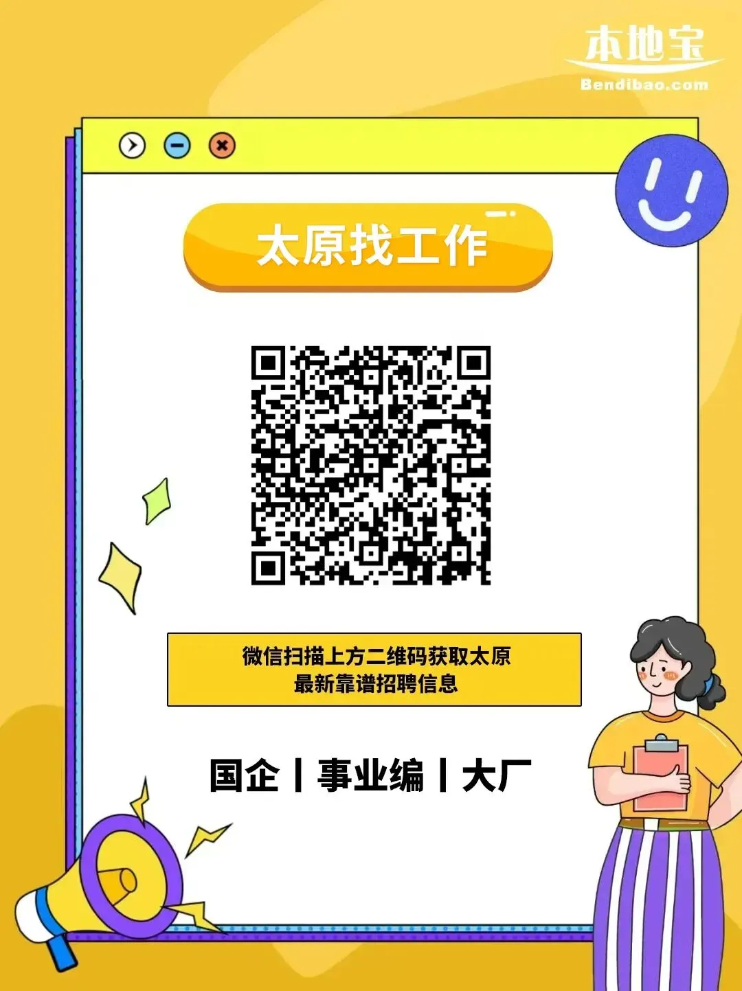 📢小编提醒:更多招聘信息原宝持续跟进中,可以扫描下方二维码进入【太原本地宝】--【找工作】栏目追更!