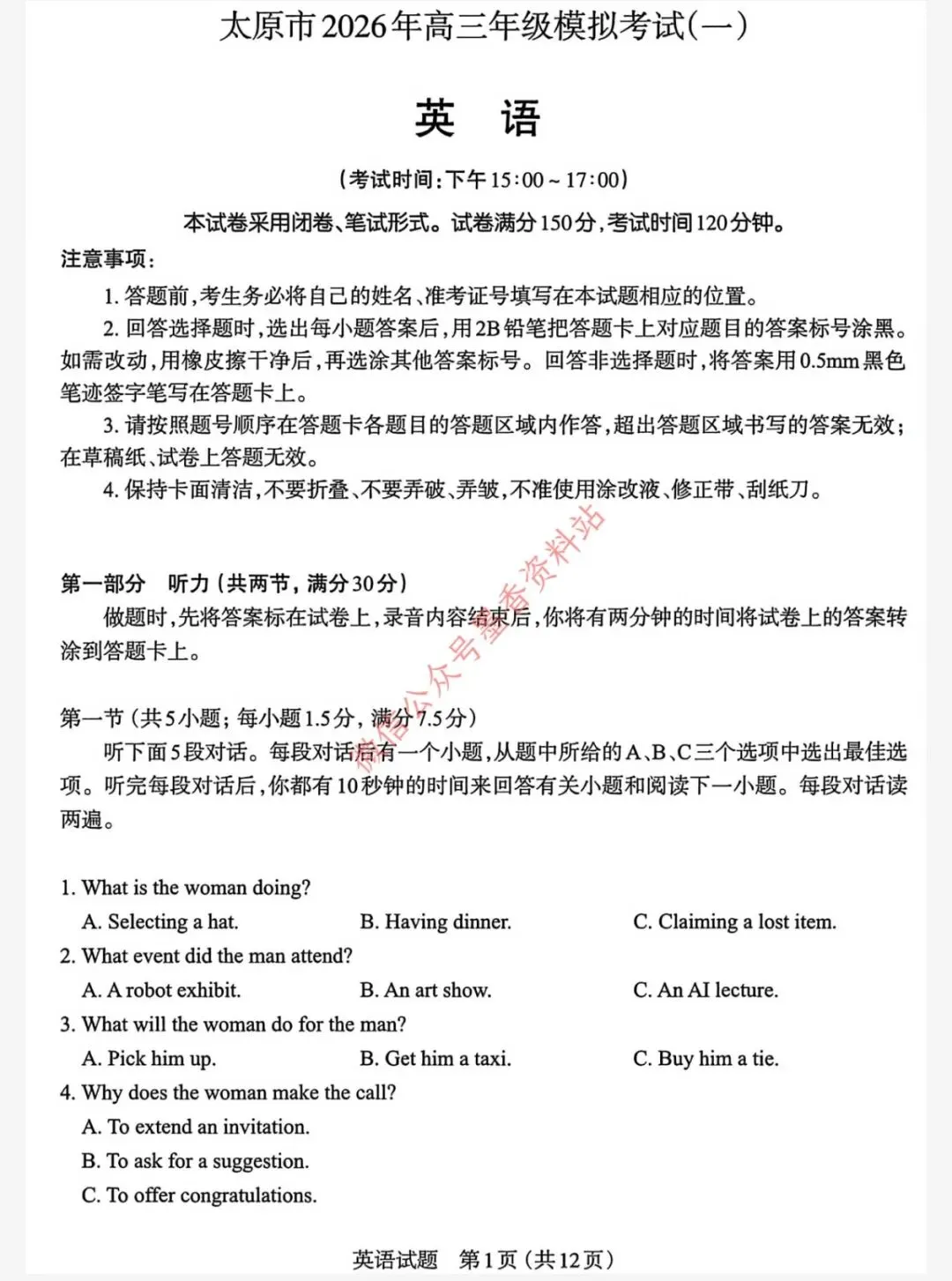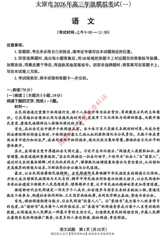 山西省太原市2026年高三年级模拟考试(一)(太原一模)英语试卷含答案