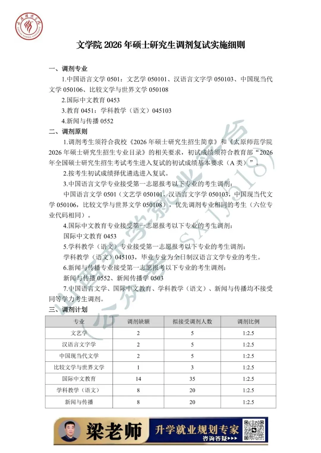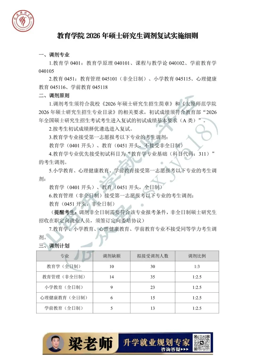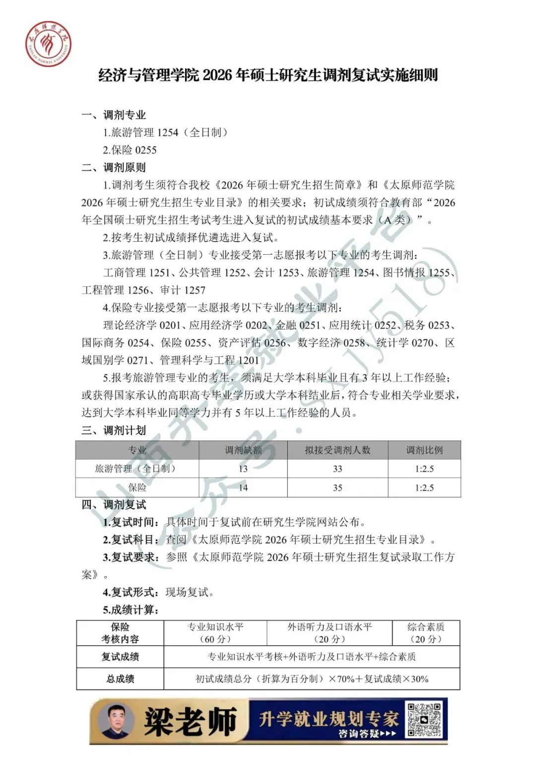 为做好太原师范学院2026年硕士研究生招生调剂工作,根据《2026年全国硕士研究生招生工作管理规定》(教学〔2025〕2号)、《关于进一步规范全国硕士研究生招生调剂工作的通知》(教学司〔2025〕5号)、《关于做好2026年全国硕士研究生招生复试录取工作的通知》(教学司〔2026〕3号)和山西省招生考试管理中心《关于做好我省2026年硕士研究生复试录取工作的通知》(晋招考研〔2026〕5号)等文件精神,结合学校实际,特制定本办法。科学制定调剂工作办法,规范流程标准,严明工作纪律,严格政策执行,推进分类选拔,切实提升招生质量。从严规范调剂管理,以学业水平为核心依据,严禁设置歧视性条件。涉及第一志愿专业等学术要求,须经本单位学位评定委员会审核。深化招生录取“阳光工程”,全面公开招生信息,强化服务意识,注重人文关怀,专人负责咨询接听与诉求答复。强化组织领导与协同联动,压实主体责任,严格执行“集体议事、集体决策、会议决定”规程,保障调剂工作安全平稳有序。1. 调剂考生须符合我校2026年硕士研究生招生简章和招生专业目录的相关要求,且初试成绩须符合教育部“2026年全国硕士研究生招生考试考生进入复试的初试成绩基本要求”(A类)。2. 调剂考生第一志愿专业与调入专业相同相近,或初试科目与调入专业初试科目相同相近。3. 初试科目为全国统一命题科目的学科,应优先接受初试参加相同全国统一命题科目的考生调剂。4. 对申请同一专业、初试科目完全相同的调剂考生,应当按考生初试成绩择优遴选进入复试。5. 旅游管理专硕可接收第一志愿报考旅游管理、工商管理、公共管理、工程管理、会计、图书情报、审计专硕的考生。6. 报考旅游管理和教育硕士中教育管理的考生,须满足大学本科毕业且有3年以上工作经验;或获得国家承认的高职高专毕业学历或大学本科结业后,符合专业相关学业要求,达到大学本科毕业同等学力并有5年以上工作经验的人员。7. 每轮次调剂均按招生计划采取差额复试形式,生源充足学科接受调剂的考生比例原则上不低于120%;不足1名的按1名计算。各院系可根据本学科专业生源及缺额情况合理设置比例。8. 须符合《太原师范学院2026年硕士研究生招生专业目录》中的报考条件,以及各院系拟定的招生复试调剂工作实施细则的相关要求。1. 我校接收的所有调剂考生均须通过教育部“全国硕士研究生招生调剂服务系统”进行。2. 太原师范学院硕士研究生招生委员会(以下简称招委会)统一管理本单位调剂工作,统一审核院系调剂细则、发布调剂信息、监督巡查、审核调剂复试及录取名单、办理相关手续。3. 各招生院系在学校招生调剂工作实施办法基础上,根据学科(专业)特点,确定调剂缺额计划、差额比例,制定本单位调剂录取工作实施细则。调剂细则须经院系学位评定分委员会讨论通过后,报招委会办公室,提交校学位评定委员会审议。4. 严禁将考生第一志愿报考单位、毕业院校、提交调剂志愿的时间先后顺序等非学业水平标准作为依据。严禁以考生所在单位、行业、地域、学校层次类别等非学业水平标准限定调剂生源范围,严禁设置歧视性调剂条件。5. 招生院系要严格按照招委会统一部署,在规定时间内开展调剂工作,严禁任何个人未经授权擅自发布调剂信息。6. 进入调剂复试考生名单,由招生院系负责人签字确认后,报送招委会办公室,经分管校领导审定后予以发布。对所有申请调剂但未进入调剂复试的考生,须逐一进行原因备注及记录,确保择优遴选、公平公正。如在本批次调剂复试录取结束后仍有缺额,须适时重新开放调剂系统。1. 研招网调剂系统将于4月8日起启用。考生要提前查看我校公告,了解拟调剂专业(领域)、名额、调剂系统开始及结束时间,登录“全国硕士研究生招生调剂服务系统”,查看调剂缺额信息并填报调剂志愿。2. 我校将在规定时间内确定是否接收考生调剂志愿并发送复试通知。若考生在我校发送复试通知前修改了调剂志愿,学校将无法发送复试通知。3. 我校通知考生参加复试后,考生应在规定时间内,登录“全国硕士研究生招生调剂服务系统”,确认参加我校复试,逾期视为自动放弃复试资格,撤销复试通知,依次递补其他考生。4. 考生要及时登录我校研究生学院网站查看复试安排和复试要求,按时参加复试。具体参照《太原师范学院2026年硕士研究生复试录取工作实施方案》及相关院系2026年调剂工作实施细则执行。复试成绩计算办法和总成绩计算办法依照《太原师范学院2026年硕士研究生复试录取工作实施方案》执行。1. 依据招生计划和调剂名额,各院系提出拟录取名单,拟录取名单经招委会审核后,及时通过调剂系统管理平台对拟录取的调剂考生发送待录取通知。如考生已接受了其他单位的待录取通知,视为主动放弃待录取资格。考生应密切关注调剂系统内的通知,须在通知规定的时间内通过调剂系统接受或拒绝接受待录取通知,逾期不接受者视为自动放弃待录取资格,学校将取消其待录取通知,递补其他考生。如因个人原因未及时确认导致待录取通知逾期被撤销的,责任由考生本人负责。2. 拟录取名单根据考生参加复试学科(专业、方向、学习形式),按考试总成绩从高分到低分依次确定。3. 复试成绩不合格(低于60分)者不予录取;同等学力者加试科目成绩不计入总分