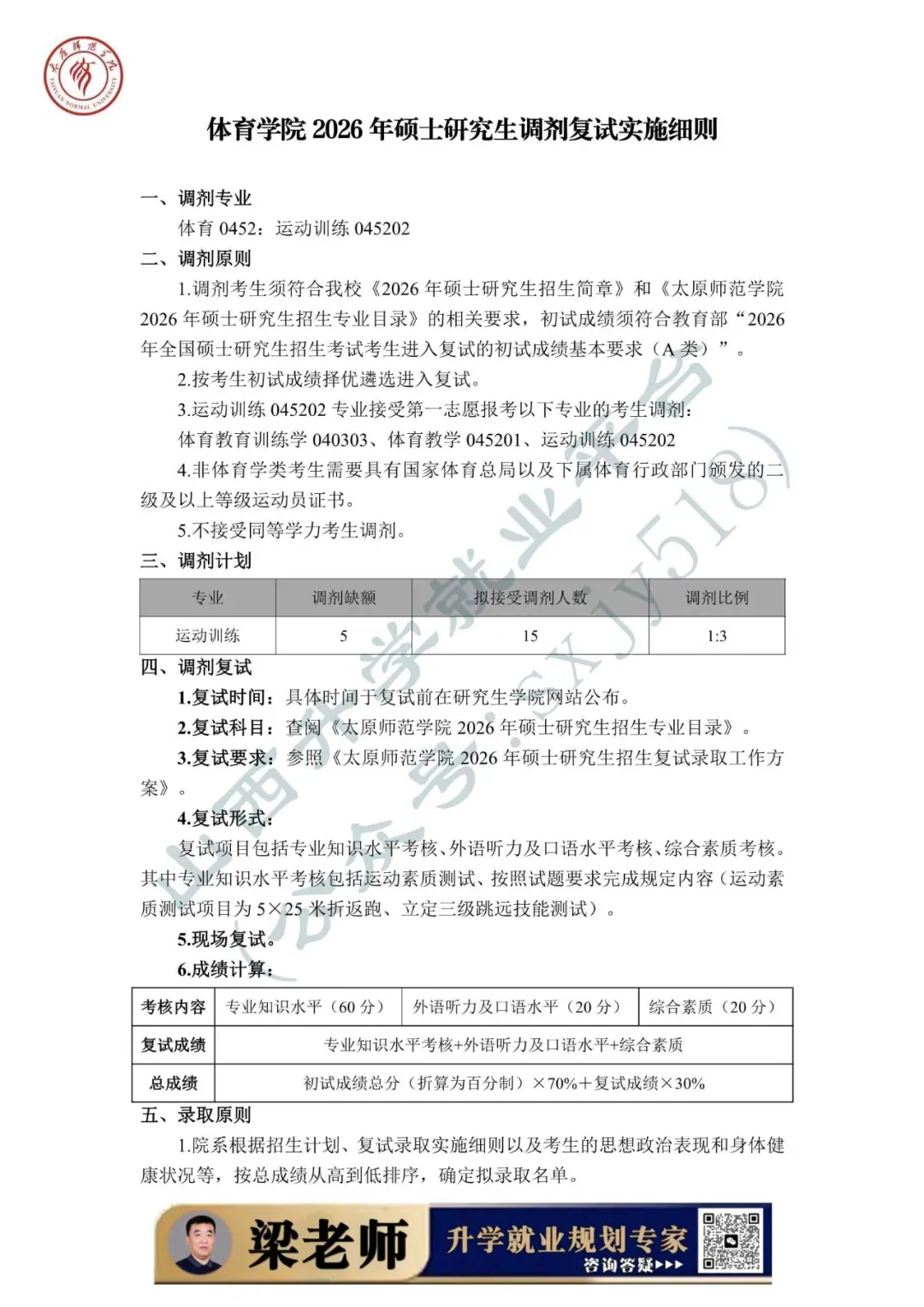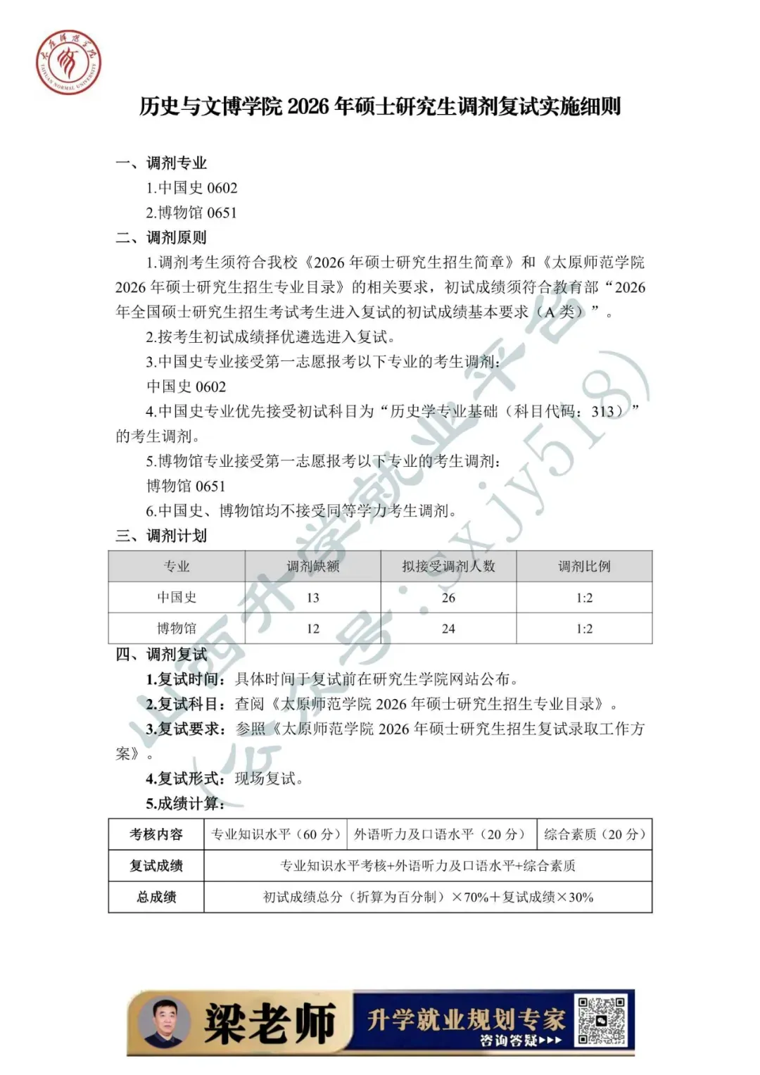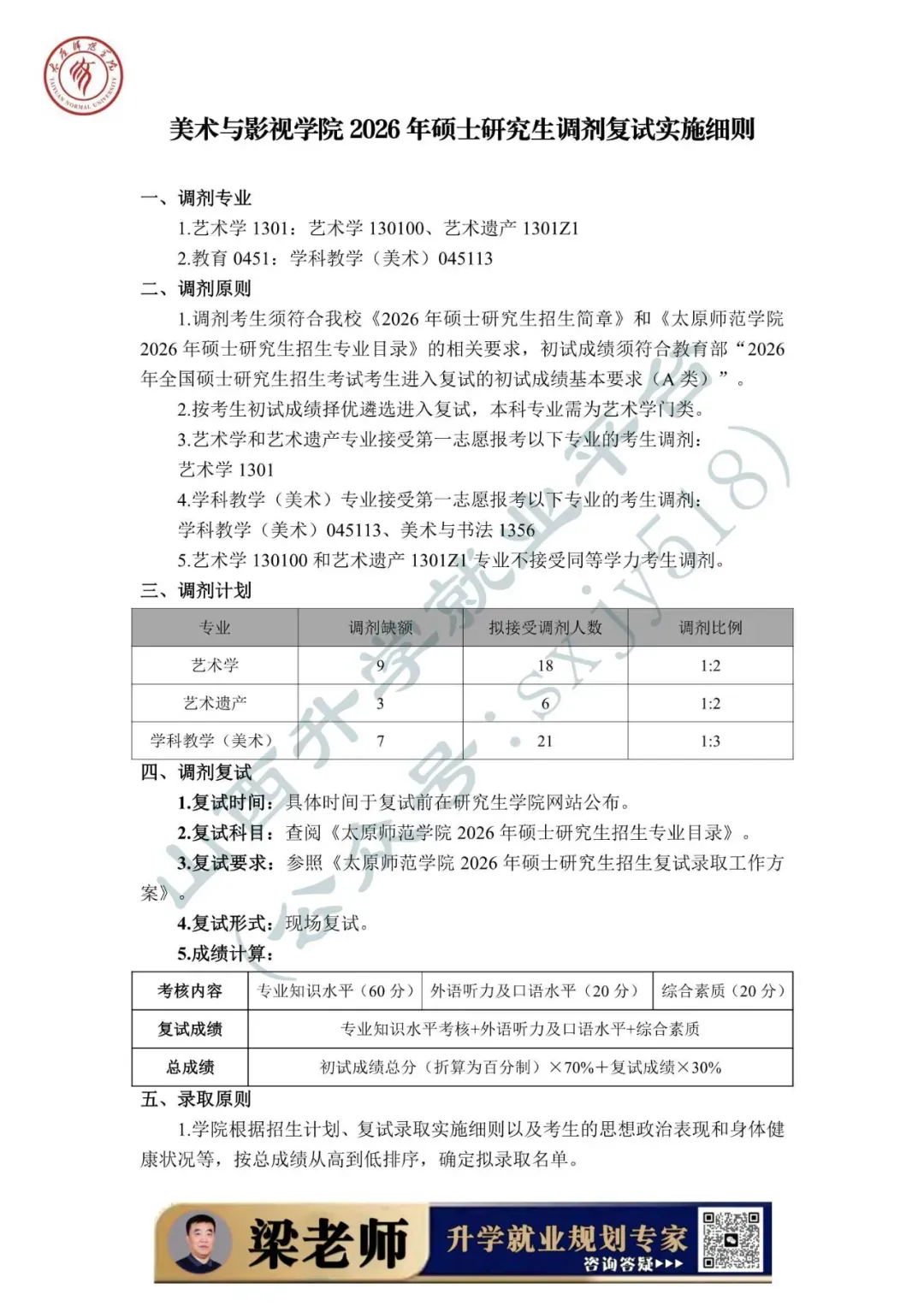 为做好太原师范学院2026年硕士研究生复试录取工作,确保复试录取工作公平公正、平安有序,根据《2026年全国硕士研究生招生工作管理规定》(教学〔2025〕2号)、《关于进一步规范全国硕士研究生招生调剂工作的通知》(教学司〔2025〕5号)、《关于做好2026年全国硕士研究生招生复试录取工作的通知》 (教学司〔2026〕3号)和山西省招生考试管理中心《关于做好我省2026年硕士研究生复试录取工作的通知》(晋招考研〔2026〕5号)等文件精神,结合学校实际,特制定本方案。把立德树人成效作为检验考试招生和培养工作的根本标准,牢固树立“考试招生育人”的理念,着力选拔培养社会主义事业合格建设者和可靠接班人。坚持德智体美劳全面衡量,以德为先,把学生思想品德考核作为复试的重要内容和录取的重要依据。以提高选拔质量为核心,进一步改进和完善复试考核评价机制,加强对考生的全面考察和综合评价,提高复试的科学性和有效性,促进高层次拔尖创新人才脱颖而出。落实学术学位与专业学位分类选拔要求,结合学科特点,分类设计复试内容。复试是硕士研究生录取的必要环节,复试不合格者不予录取。科学制定复试工作流程和应急预案,确保复试工作的安全性、可靠性和稳定性。建立强有力的组织保障和监管工作机制,有效堵塞失职失责漏洞,从源头遏制各类违规违纪违法行为,维护复试录取工作的严肃性和权威性。加强信息公开,及时、准确做好政策宣传解读、咨询答复等服务保障工作,实施招生录取“阳光工程”。强化人性化安排和个性化关怀,增强服务意识,尽可能缩短考生调剂等待时间,及时受理并帮助考生妥善解决复试中遇到的突发问题。学校成立由党委书记、校长担任主任的太原师范学院硕士研究生招生委员会(以下简称招委会),全面负责研究生招生复试录取工作,严格执行“集体议事、集体决策、会议决定”的规程,审议决策考试招生重大事项等。招委会办公室下设9个工作组,统筹协作完成复试各项工作。我校一志愿考生复试时间为2026年3月21日—22日。调剂考生复试工作预计于调剂端口开放后一周内进行,具体时间以研究生学院网站公布为准。复试方式为现场复试,满分为100分,由专业知识水平考核、外语听力及口语水平考核、综合素质考核三部分组成。1. 专业知识水平考核重点考核考生本专业的基础理论、基本知识、基本技能的熟悉、理解和掌握程度,以及分析问题和解决问题的能力。2. 外语听力及口语水平考核重点考核考生外语听说能力和英语综合水平。3. 综合素质考核重点考核考生的创新意识、沟通能力、心理素质、及发展潜力等。各招生院系可依据学科特点和实际需求,选择笔试或者现场问答的方式完成考核。1. 旅游管理专硕以外专业(领域)的专业知识水平考核满分为60分,外语听力及口语水平考核20分、综合素质考核20分。2. 旅游管理专硕的专业知识水平满分为40分,思想政治理论、外语听力及口语水平、综合素质满分分别为20分。3. 同等学力考生须加试两门与报考专业(领域)相关的本科主干课程。加试科目按《太原师范学院2026硕士研究生招生专业目录》公布的范围执行。每门课程满分为100分,60分为合格。加试方式为笔试,考试时间为60分钟,由院系组织,成绩于当日汇总至研究生学院。符合教育部规定的A类考生进入复试的初试成绩基本要求。生源充足的院系根据录取计划,按照不低于1:1.2的比例划定进入复试的初试成绩基本要求。依据教育部有关政策,我校自主确定的“退役大学生士兵计划”复试分数线以A类考生进入复试的初试成绩基本要求为基准,对总分及单科分数线降分8%划定分数线。纳入“退役大学生士兵计划”招生录取的考生,不再享受退役大学生士兵初试加分政策。2. 初试成绩达国家线的人数占我校该专业(领域)招生计划人数的比例大于100%的专业(领域),其复试人数按不低于该专业(领域)招生计划人数的120%确定。3. 初试成绩达到国家线,且一志愿报考我校的考生人数,不超过本专业(领域)招生计划数的,原则上全部安排参加复试。各院系要结合工作实际制定本院系工作细则,包括院系复试工作领导组构成、复试内容及形式、实施程序、录取标准、应急处理及其他具体要求等内容。调剂要求应当切实可行,不存在歧义表述或造成理解困难的语句,不得同《太原师范学院2026年硕士研究生招生简章》及《太原师范学院2026硕士研究生招生专业目录》相违背。1. 院系复试工作领导组按照规定成立命题小组,并在规定时间内组织命题。2. 各专业应准备充足的复试试题。复试试题应尽量采用综合性、开放性试题,确保能够有效考查考生的专业素养和综合能力。3. 复试科目及内容严格按照《太原师范学院2026年硕士研究生招生专业目录》中的“复试科目”制订。4. 复试试题按《太原师范学院硕士研究生招生考试自命题工作规范》(院政字〔2020〕118号)文件要求执行,命制后在学校试题保密室保存,于复试前取出。1. 复试面试过程坚持“三随机”(随机选定考生次序、随机确定考核组人员、随机抽取复试试题)的管理方式,加强面试过程监管,严防“作弊”。2. 每位考生面试时间不少于20分钟(必须在考生明确表示已作答完毕后,才可提前结束考核),全程录音录像,严禁弄虚作假、徇私舞弊。3. 考生最终面试成绩为所有专家