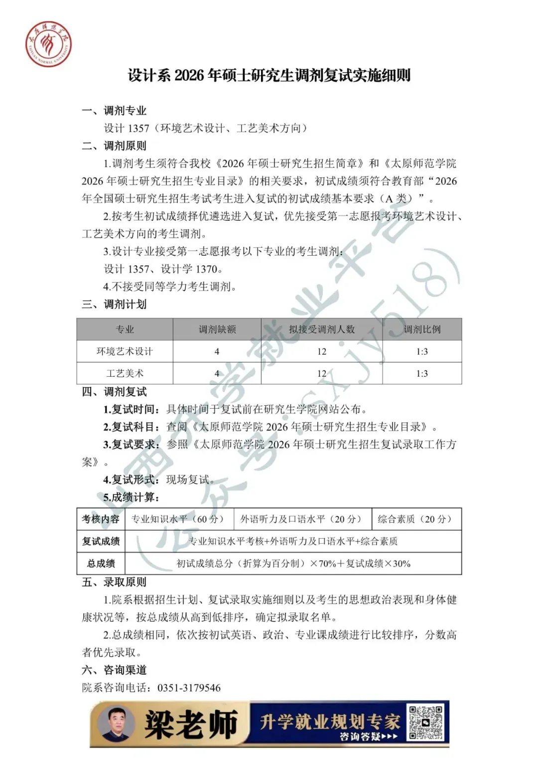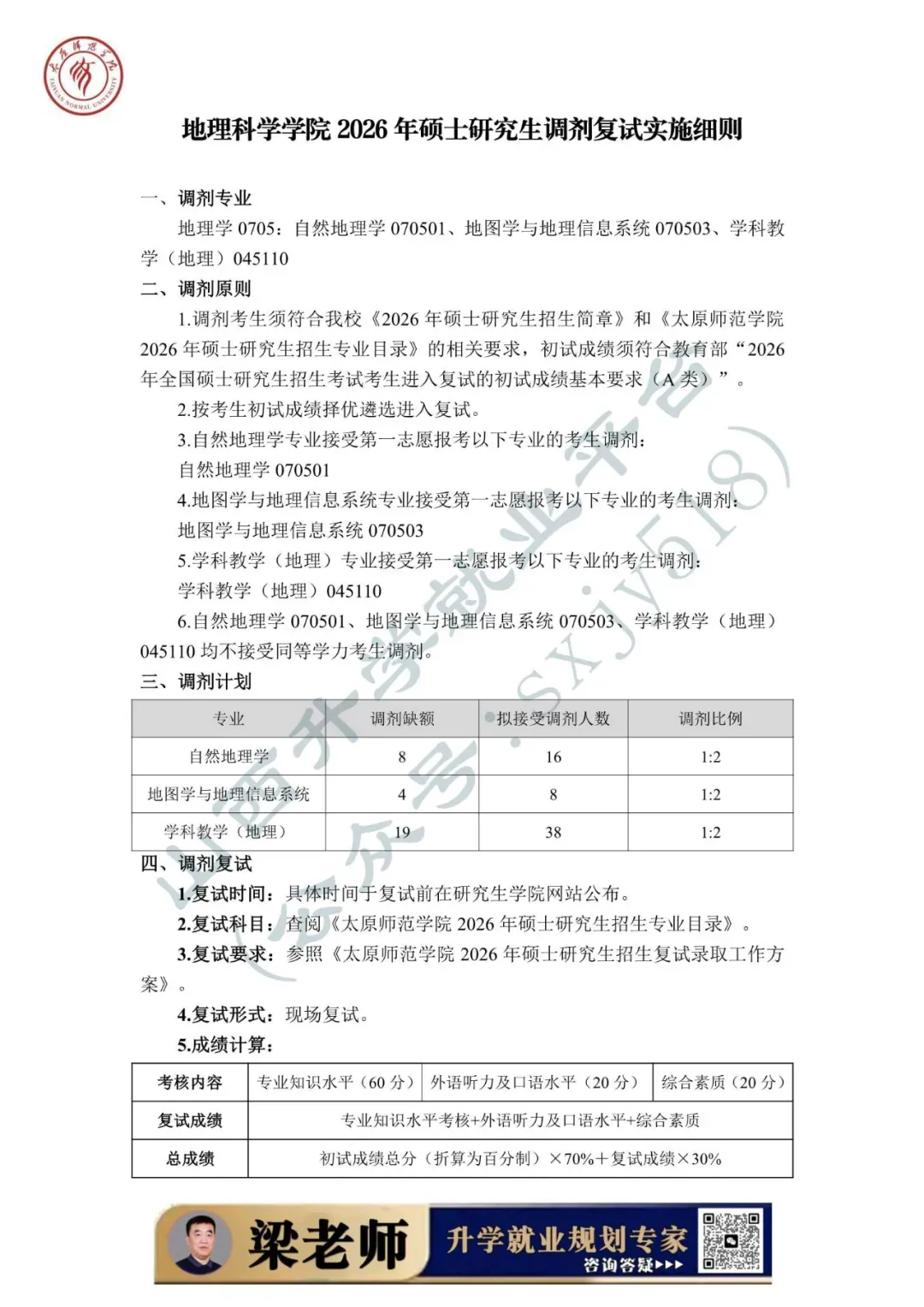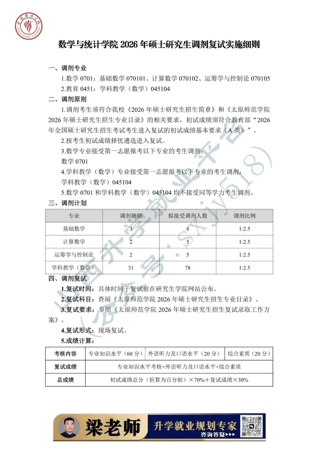 为做好太原师范学院2026年硕士研究生复试录取工作,确保复试录取工作公平公正、平安有序,根据《2026年全国硕士研究生招生工作管理规定》(教学〔2025〕2号)、《关于进一步规范全国硕士研究生招生调剂工作的通知》(教学司〔2025〕5号)、《关于做好2026年全国硕士研究生招生复试录取工作的通知》 (教学司〔2026〕3号)和山西省招生考试管理中心《关于做好我省2026年硕士研究生复试录取工作的通知》(晋招考研〔2026〕5号)等文件精神,结合学校实际,特制定本方案。把立德树人成效作为检验考试招生和培养工作的根本标准,牢固树立“考试招生育人”的理念,着力选拔培养社会主义事业合格建设者和可靠接班人。坚持德智体美劳全面衡量,以德为先,把学生思想品德考核作为复试的重要内容和录取的重要依据。以提高选拔质量为核心,进一步改进和完善复试考核评价机制,加强对考生的全面考察和综合评价,提高复试的科学性和有效性,促进高层次拔尖创新人才脱颖而出。落实学术学位与专业学位分类选拔要求,结合学科特点,分类设计复试内容。复试是硕士研究生录取的必要环节,复试不合格者不予录取。科学制定复试工作流程和应急预案,确保复试工作的安全性、可靠性和稳定性。建立强有力的组织保障和监管工作机制,有效堵塞失职失责漏洞,从源头遏制各类违规违纪违法行为,维护复试录取工作的严肃性和权威性。加强信息公开,及时、准确做好政策宣传解读、咨询答复等服务保障工作,实施招生录取“阳光工程”。强化人性化安排和个性化关怀,增强服务意识,尽可能缩短考生调剂等待时间,及时受理并帮助考生妥善解决复试中遇到的突发问题。学校成立由党委书记、校长担任主任的太原师范学院硕士研究生招生委员会(以下简称招委会),全面负责研究生招生复试录取工作,严格执行“集体议事、集体决策、会议决定”的规程,审议决策考试招生重大事项等。招委会办公室下设9个工作组,统筹协作完成复试各项工作。我校一志愿考生复试时间为2026年3月21日—22日。调剂考生复试工作预计于调剂端口开放后一周内进行,具体时间以研究生学院网站公布为准。复试方式为现场复试,满分为100分,由专业知识水平考核、外语听力及口语水平考核、综合素质考核三部分组成。1. 专业知识水平考核重点考核考生本专业的基础理论、基本知识、基本技能的熟悉、理解和掌握程度,以及分析问题和解决问题的能力。2. 外语听力及口语水平考核重点考核考生外语听说能力和英语综合水平。3. 综合素质考核重点考核考生的创新意识、沟通能力、心理素质、及发展潜力等。各招生院系可依据学科特点和实际需求,选择笔试或者现场问答的方式完成考核。1. 旅游管理专硕以外专业(领域)的专业知识水平考核满分为60分,外语听力及口语水平考核20分、综合素质考核20分。2. 旅游管理专硕的专业知识水平满分为40分,思想政治理论、外语听力及口语水平、综合素质满分分别为20分。3. 同等学力考生须加试两门与报考专业(领域)相关的本科主干课程。加试科目按《太原师范学院2026硕士研究生招生专业目录》公布的范围执行。每门课程满分为100分,60分为合格。加试方式为笔试,考试时间为60分钟,由院系组织,成绩于当日汇总至研究生学院。符合教育部规定的A类考生进入复试的初试成绩基本要求。生源充足的院系根据录取计划,按照不低于1:1.2的比例划定进入复试的初试成绩基本要求。依据教育部有关政策,我校自主确定的“退役大学生士兵计划”复试分数线以A类考生进入复试的初试成绩基本要求为基准,对总分及单科分数线降分8%划定分数线。纳入“退役大学生士兵计划”招生录取的考生,不再享受退役大学生士兵初试加分政策。2. 初试成绩达国家线的人数占我校该专业(领域)招生计划人数的比例大于100%的专业(领域),其复试人数按不低于该专业(领域)招生计划人数的120%确定。3. 初试成绩达到国家线,且一志愿报考我校的考生人数,不超过本专业(领域)招生计划数的,原则上全部安排参加复试。各院系要结合工作实际制定本院系工作细则,包括院系复试工作领导组构成、复试内容及形式、实施程序、录取标准、应急处理及其他具体要求等内容。调剂要求应当切实可行,不存在歧义表述或造成理解困难的语句,不得同《太原师范学院2026年硕士研究生招生简章》及《太原师范学院2026硕士研究生招生专业目录》相违背。1. 院系复试工作领导组按照规定成立命题小组,并在规定时间内组织命题。2. 各专业应准备充足的复试试题。复试试题应尽量采用综合性、开放性试题,确保能够有效考查考生的专业素养和综合能力。3. 复试科目及内容严格按照《太原师范学院2026年硕士研究生招生专业目录》中的“复试科目”制订。4. 复试试题按《太原师范学院硕士研究生招生考试自命题工作规范》(院政字〔2020〕118号)文件要求执行,命制后在学校试题保密室保存,于复试前取出。1. 复试面试过程坚持“三随机”(随机选定考生次序、随机确定考核组人员、随机抽取复试试题)的管理方式,加强面试过程监管,严防“作弊”。2. 每位考生面试时间不少于20分钟(必须在考生明确表示已作答完毕后,才可提前结束考核),全程录音录像,严禁弄虚作假、徇私舞弊。3. 考生最终面试成绩为所有专家