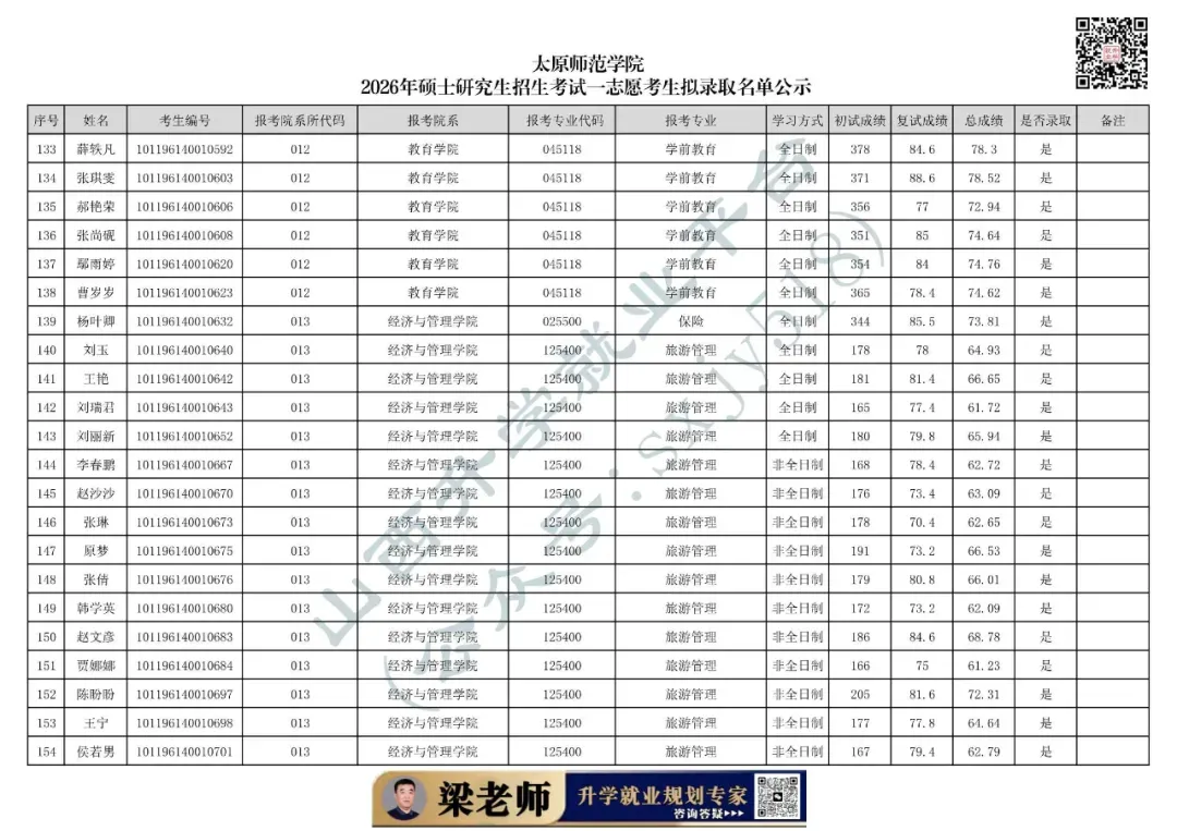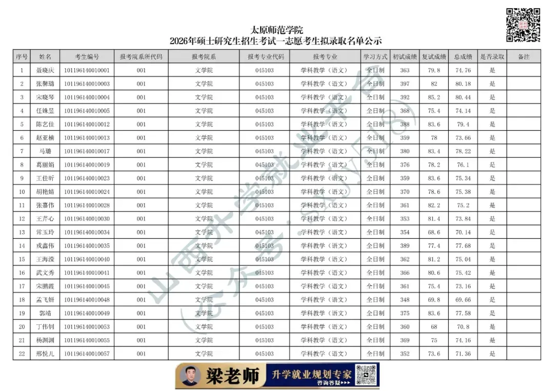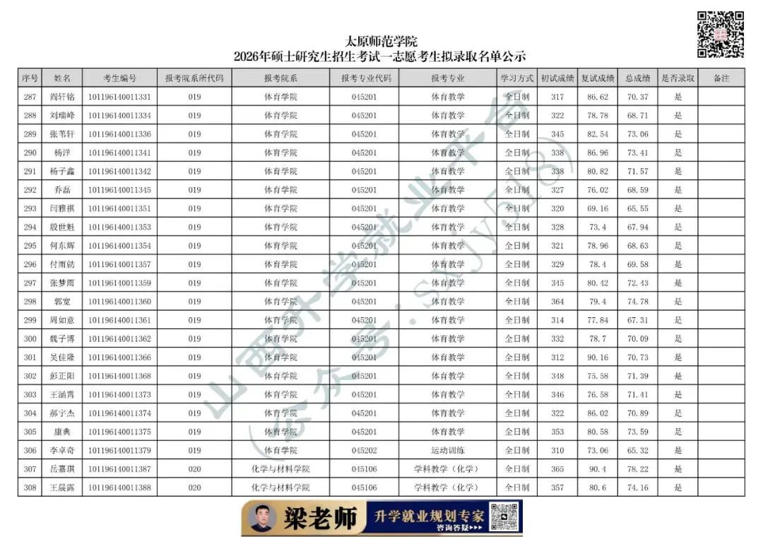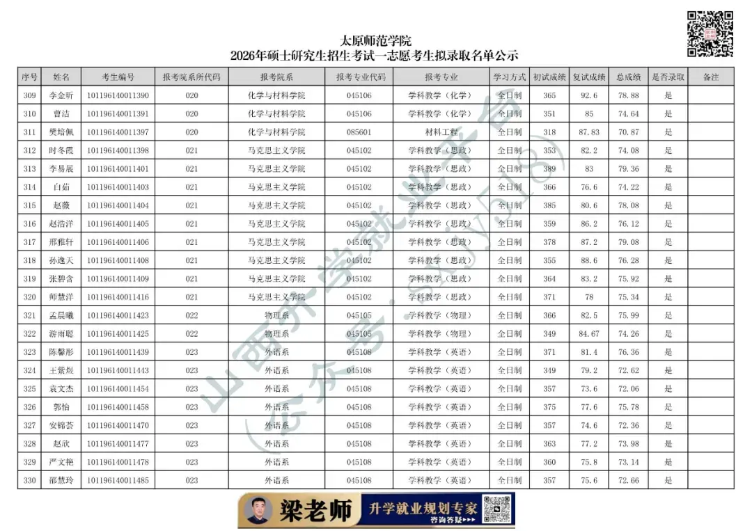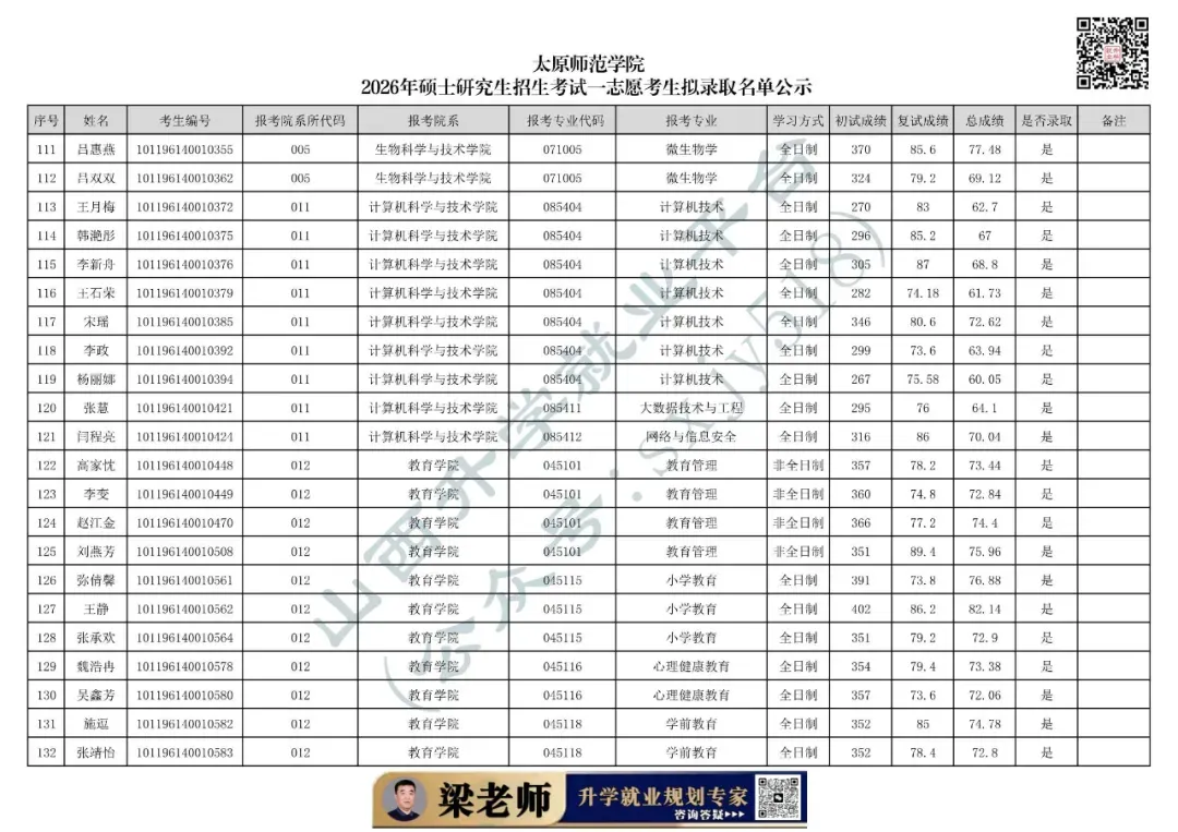 太原师范学院2026年硕士研究生招生考试一志愿考生拟录取名单公示