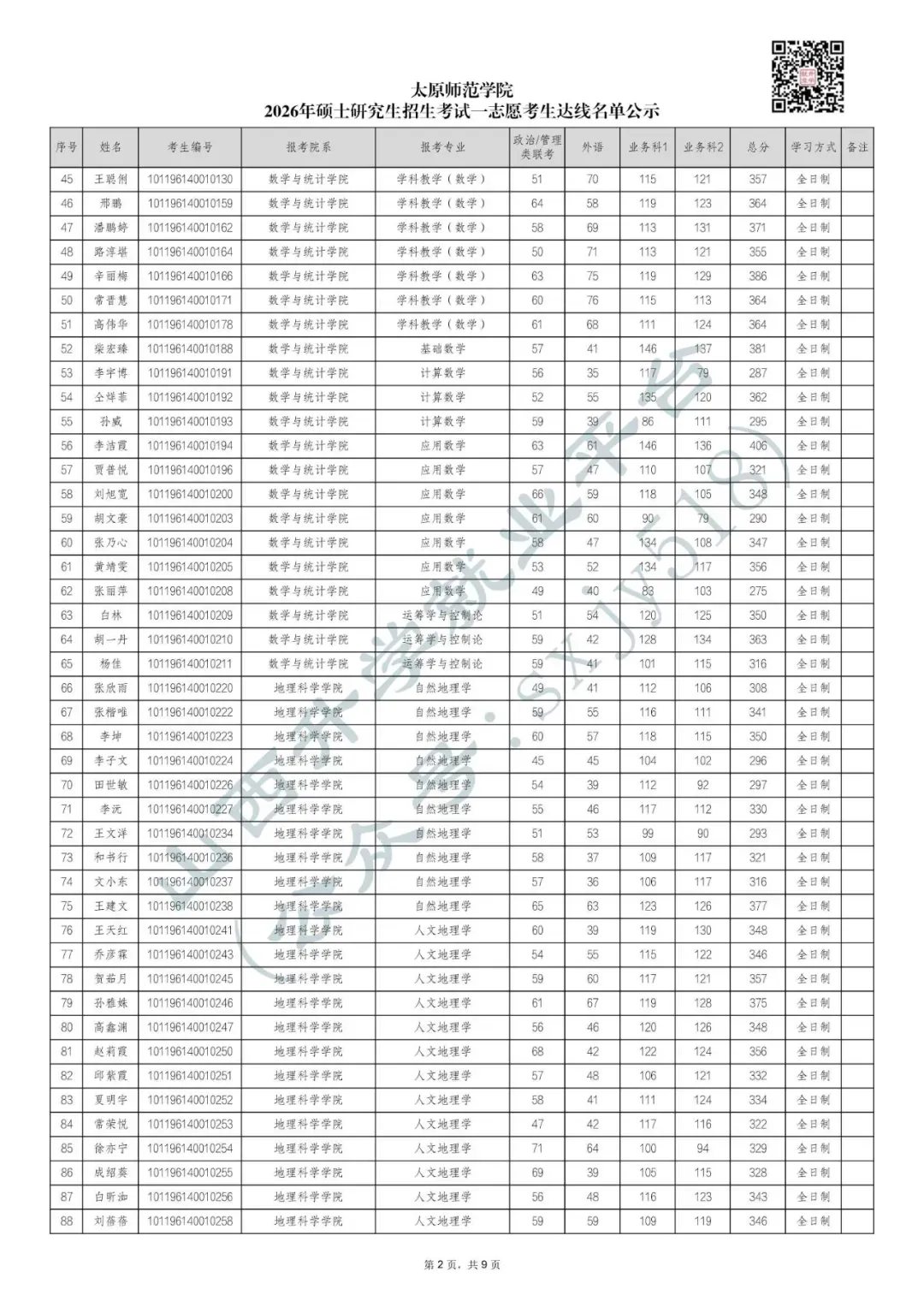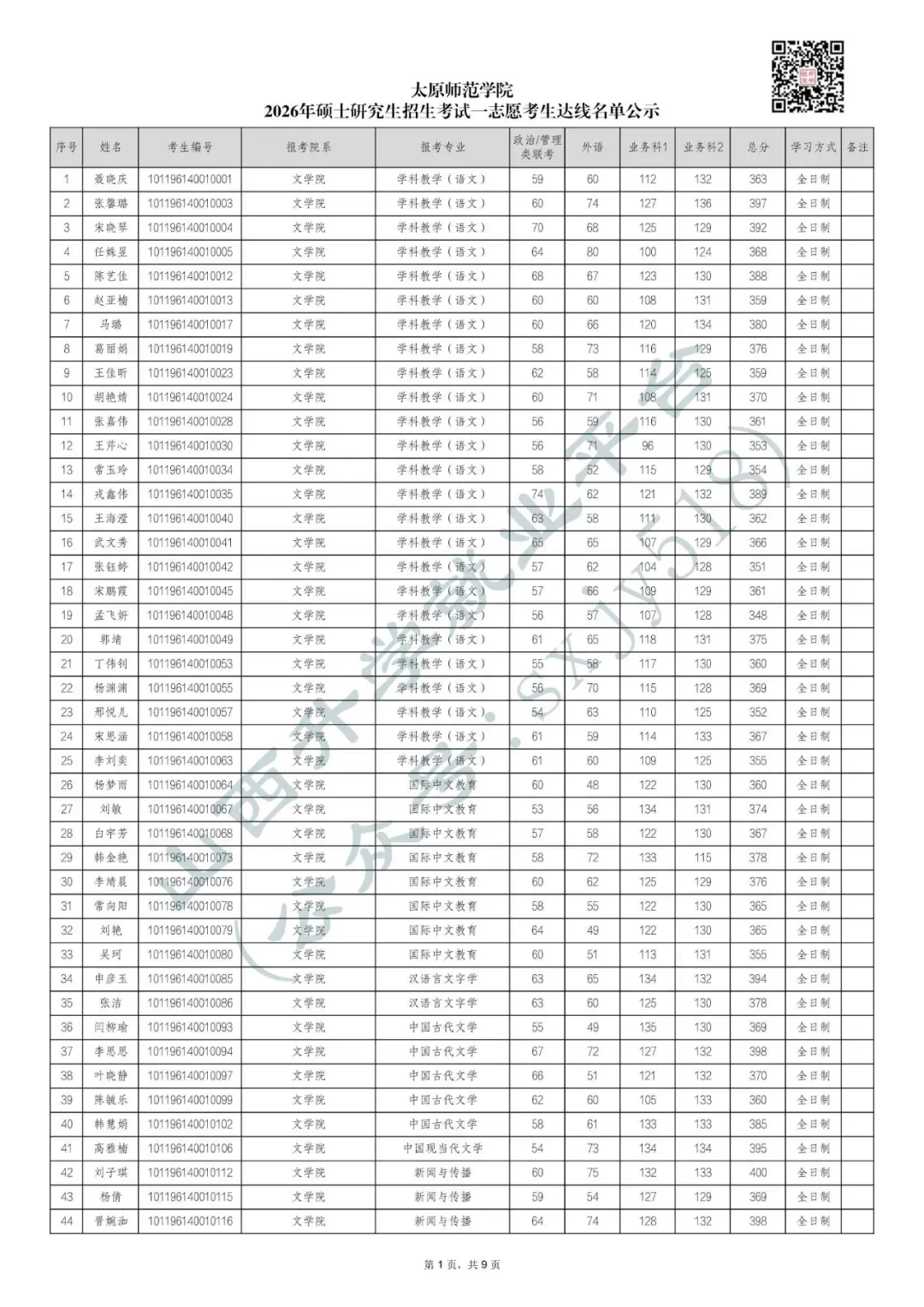 根据教育部《2026年全国硕士研究生招生考试考生进入复试的初试成绩基本要求》和《太原师范学院2026年硕士研究生招生考试一志愿考生进入复试的初试成绩基本要求》,现将符合条件的一志愿复试考生名单予以公示。