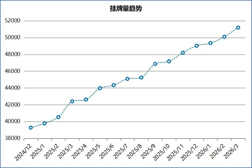 二手房挂牌量持续突破新高,最近甚至有加速迹象。现在已经来到5.1万套的水平,而24年底还不到4万套。成交量变化不大的情况下,成交周期不断拉长。