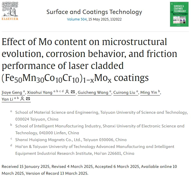 原文标题:Effect of Mo content on microstructural evolution, corrosion behavior, and friction performance of laser cladded (Fe50Mn30Co10Cr10)1−xMox coatings