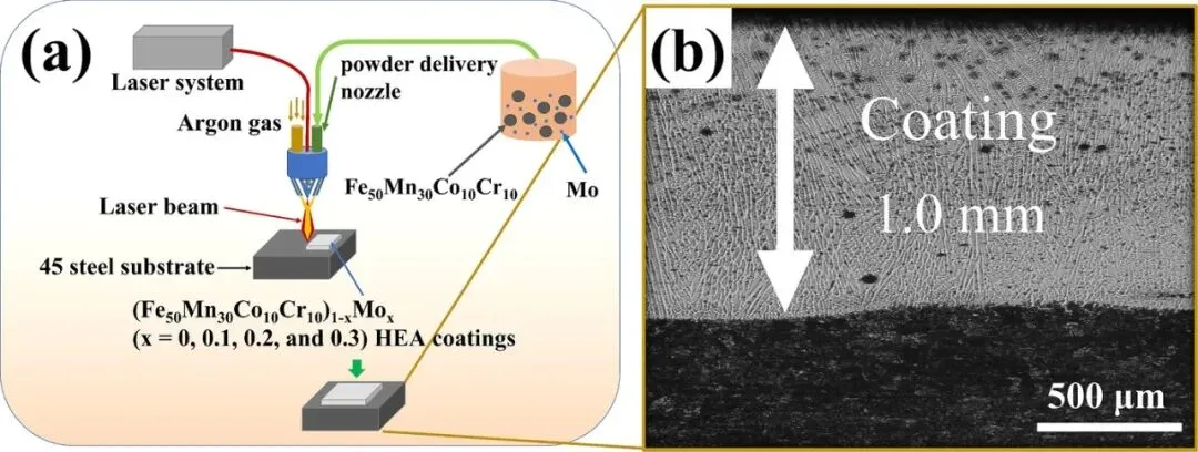 图2:展示了本研究的工艺流程和制备的涂层宏观形貌。图(a)详细说明了(Fe50Mn30Co10Cr10)1-xMox涂层激光熔覆的工艺流程图,包括混合粉末的制备、基材预处理、激光熔覆以及后处理等关键步骤。图(b)展示了熔覆后涂层的宏观截面形貌,涂层厚度达到1.2毫米,结构致密均匀,与基体形成了良好的冶金结合,验证了所选工艺参数的可行性和涂层质量。