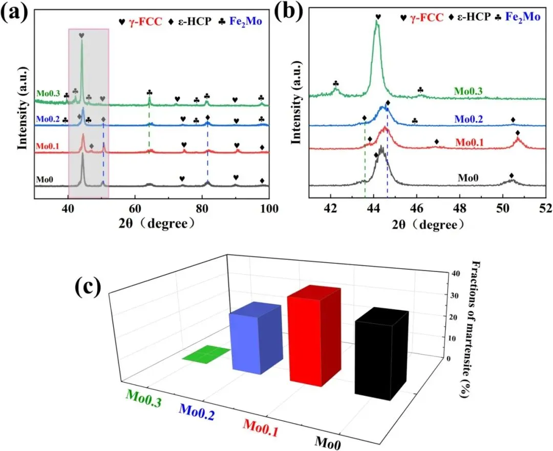 图3:展示了(Fe50Mn30Co10Cr10)1-xMox涂层的X射线衍射(XRD)图谱及其分析。图谱显示涂层中存在Fe2Mo、ε-马氏体(HCP)和γ-奥氏体(FCC)相。在Mo含量为0.1 at.%时,HCP相的衍射峰最为显著,表明适量的Mo促进了HCP相的形成。随着Mo含量继续增加(Mo0.2, Mo0.3),HCP相的衍射峰强度逐渐减弱,表明过量的Mo抑制了奥氏体向马氏体的转变。同时,Fe2Mo相的衍射峰强度随Mo含量增加而增强,特别是在Mo0.3涂层中最为明显,表明过量的Mo与Fe形成析出相,而非完全固溶于基体。此外,(111)衍射峰随Mo含量增加而向右偏移,这归因于较大原子半径的Mo导致的晶格畸变。