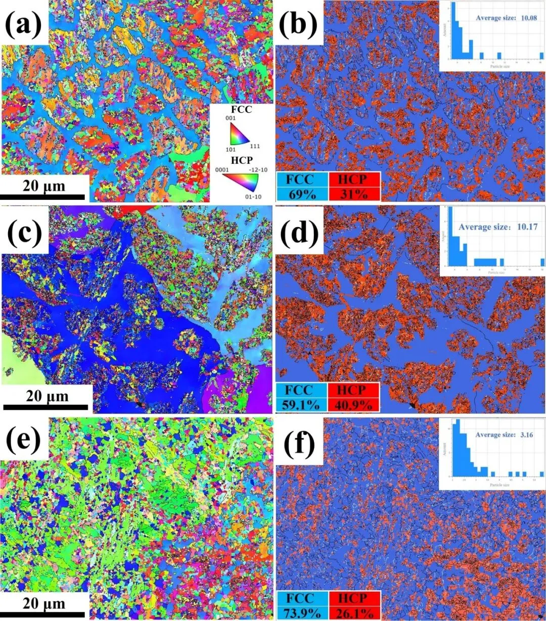 图5:展示了Mo0、Mo0.1和Mo0.2涂层的电子背散射衍射(EBSD)分析结果。图(a)、(c)、(e)为晶粒取向图,黑色和白色线条分别代表高角度晶界(HAGB, θ>15°)和低角度晶界(LAGB, θ:2°-15°)。图(b)、(d)、(f)为相应的两相(FCC/HCP)分布图。量化结果显示,随着Mo含量增加,HCP相的体积分数先增后减,分别为31%(Mo0)、40.9%(Mo0.1)和26.1%(Mo0.2)。这一结果再次证实了适量Mo(x≤0.1 at.%)促进HCP相转变,而过量Mo(x>0.1 at.%)则因晶粒细化(如插图所示的平均晶粒尺寸减小)为FCC相提供了更稳定的环境,从而抑制了HCP相变。