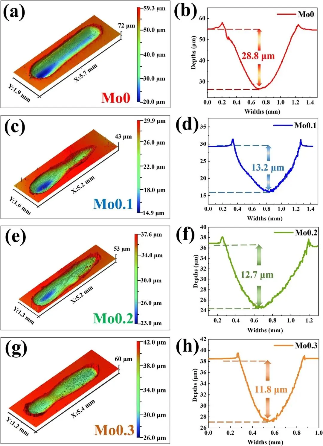 图9:展示了(Fe50Mn30Co10Cr10)1-xMox涂层的三维光学形貌图,揭示了摩擦测试后的磨损形貌。所有涂层的磨痕都呈近似椭圆形。随着Mo含量增加,磨痕的深度和宽度系统性地减小。其中,Mo0.3涂层的磨痕深度和宽度最小,表现出最佳的耐磨性。这表明涂层的磨损与硬度(如图7所示)呈正相关,符合Archard定律,即较高的硬度有助于抵抗磨损。同时,Mo的加入改变了涂层的微观结构和磨损机制,进一步提升了其耐磨性能。
