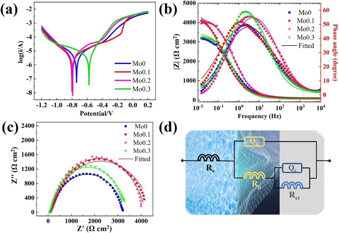 ③ 深入解析了Mo提升耐腐蚀性的“双重角色”:一方面,形成保护性Mo氧化物钝化膜提升耐蚀性;另一方面,过量Mo形成的阴极性Fe2Mo析出相破坏钝化膜完整性,诱发点蚀,反而降低耐蚀性,从而明确了最佳耐蚀性对应的成分窗口(Mo0.1)。
