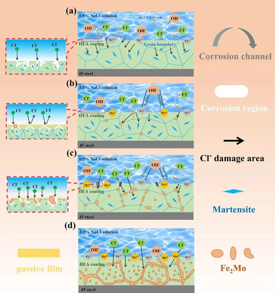 图14:以示意图形式,阐明了不同Mo含量涂层在3.5% NaCl溶液中的腐蚀机制。对于不含Mo的涂层(Moo),由于缺乏保护性Mo氧化物且马氏体含量高,耐蚀性最差。适量添加Mo(Mo0.1)能促进形成稳定的MoO3/MoO2保护性钝化膜,同时Fe2Mo析出相含量较低,对钝化膜的破坏小,因而耐蚀性最佳。随着Mo含量进一步增加(Mo0.2, Mo0.3),涂层中Fe2Mo析出相的数量和尺寸显著增加。这些电位较高的Fe2Mo相作为阴极,与基体(FCC相)形成宏观原电池,并作为表面缺陷吸引Cl-,诱发点蚀,从而破坏了钝化膜的完整性,加速了腐蚀进程,导致耐腐蚀性下降。