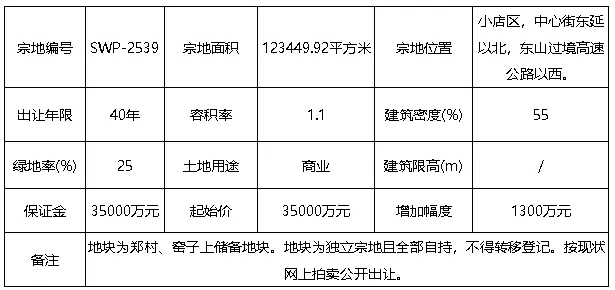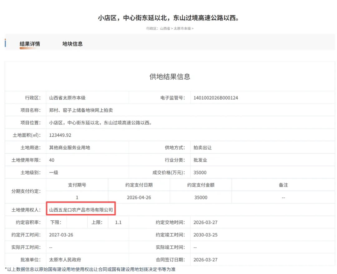 地块编号为 SWP-2539 的商业用地,最终由山西五龙口农产品市场有限公司以35000万元的价格成功竞得。