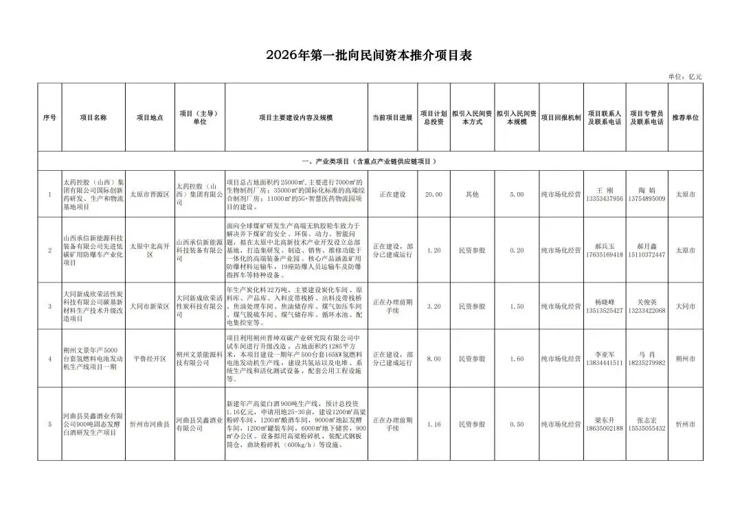省发展改革委、省民营经济局组织各市重点围绕我省民营百强企业、大型民营企业和民营科技领军企业等,遴选了2026年第一批向民间资本推介项目。本批项目共30个,计划总投资221亿元,计划引入民间资本52亿元。欢迎民营企业积极洽谈跟进,参与项目的投资建设运营。